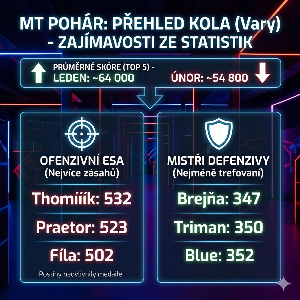 Únorové kolo v Karlových Varech jasně ukázalo, jak velký vliv má aréna na výsledné statistiky. Kvůli nižšímu počtu hráčů a menšímu množství speciálních cílů se celková skóre pohybovala níže než v lednu. Zatímco v prvním kole byl průměr první pětky přibližně 64 000 bodů, ve Varech klesl na 54 800 bodů.