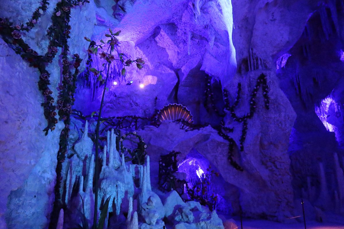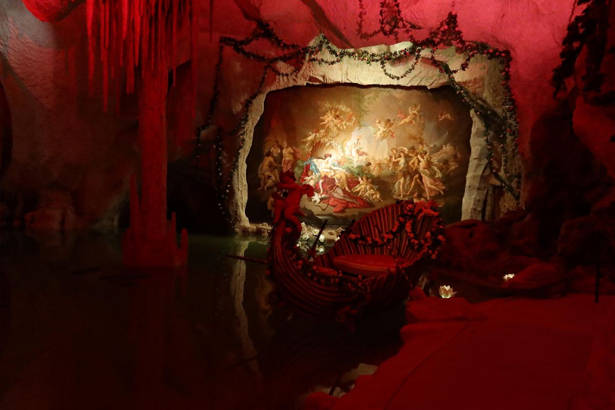 V jeskyni se výjimečně mohlo fotit. Je celá umělá, od začátku v ní bylo elektrické osvětlení, a byla koncipována jako kulisy k prvnímu aktu Wagnerova Lohengrina. Patrně se tam někde schovával orchestr, aby mohl králi hrát, ale přesný mechanismus není doložený, je možné, že to byla nahrávka. Jestli to tedy bylo v té době možné. Voda v jezírku se dala ohřát asi na 35 stupňů, takže se v ní dalo koupat. Barva světla se dala měnit. Dalo se zhasínat a rozsvěcet. Nahoře na skále je mušlový trůn a na druhé straně je vypouklé zrcadlo, aby byl z trůnu vidět celý prostor jeskyně. Vizuálně to bylo krásné a mohlo by to být magické, kdyby to nebylo tak kašírované. Já vím, že to bylo drahé a zázrak techniky a kdesi cosi, ale mně to přišlo až moc umělé. Chybí tam genius loci. Nechápu germánské legendy. V nějakém videu si je ještě podrobně rozebereme. Hlavně toho problematického Lohengrina. Když jsem si tu legendu přečetla, řekla jsem, že je pitomá. Margi je toho názoru, že je blbá.