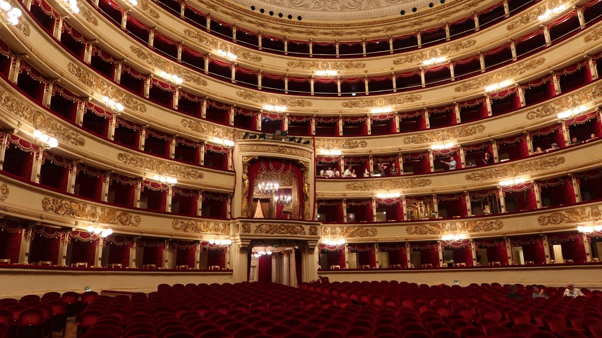 V jednu odpoledne jsme šly na prohlídku La Scaly. Hezky jsme navázaly na Veronu, protože divadlo má své jméno podle rodiny La Scala, která vládla ve Veroně. Jedna příslušnice rodiny se vdala do Milána a nechala tam postavit kostel. Divadlo stojí na místě tohoto kostela. Prohlídla byla v italštině. Říkala jsem, že se budeme spíš dívat, než poslouchat. Ono je to komplikované. Byla bych vzala německou, ale měli ono je to tak, že se prohlídky dají koupit vždycky na začátku měsíce a jsou načasované tak, aby návštěvníci nerušili herce při zkouškách. Každý den jsou prohlídky v různých jazycích v různé hodiny. V úvahu připadala anglická v 10, ale to bychom musely z Verony vyjet nejpozději v 8 ráno, což by znamenalo brzo vstávat. Ten den byla ještě francouzská a španělská, a to už mi tak italská přišla srozumitelnější.