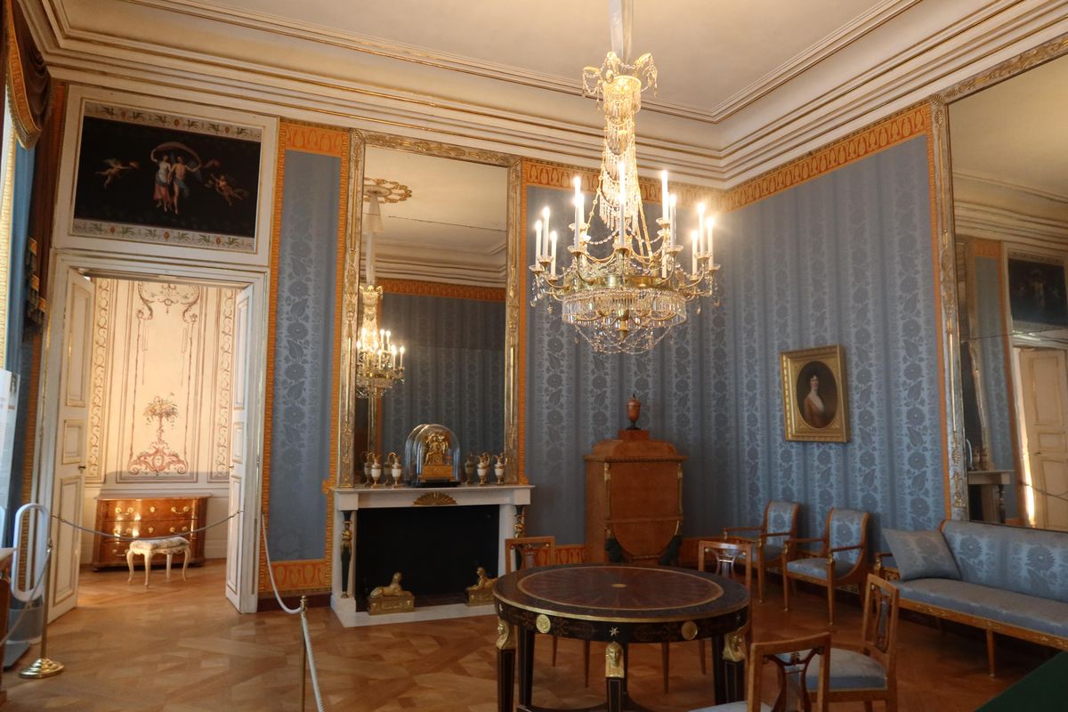 Zámek jsme viděli už od zastávky. Ale to nebylo to hlavní. Konečně jsme viděli labutě. K zámku vede vodní kanál, který ústí do jezírek a fontán před budovou. Je třeba zdůraznit, že podstatnou část kouzla tohoto letního sídla tvoří právě vodní plochy. A dokonalá symetrie. A v neposlední řadě počasí. Teď jsem se dívala na fotky na Google Street View a dokonce i oficiálním webu a je to hrůza.