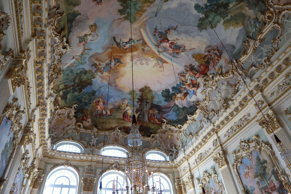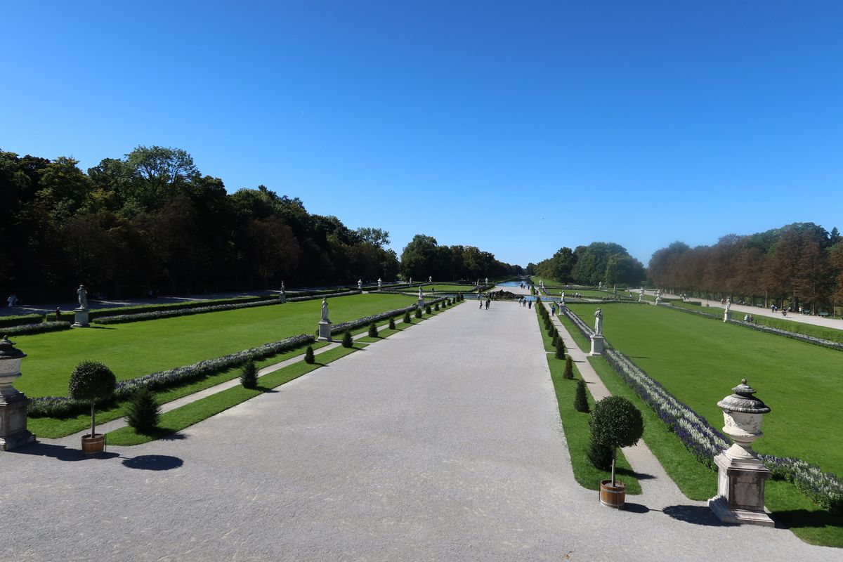 Vyznačuje se nejenom přesnou symetrií, ale i tím, že z bočních křídel vychází kruhová zástavba zvaná Schlossrondell, což jsou budovy malých zámečků spojené zdí nebo chodbou, nevím, přesně, uvnitř jsme nebyli. Brada to zaujalo možná víc než zámek a pídil se po tom, jaký byl účel těchto budov. Tipovala jsem, že tam patrně žili správci a úředníci, které chtěl mít král po ruce, ale zároveň je nechtěl mít doma, a hádala jsem správně. V jedné z nich je porcelánová manufaktura.