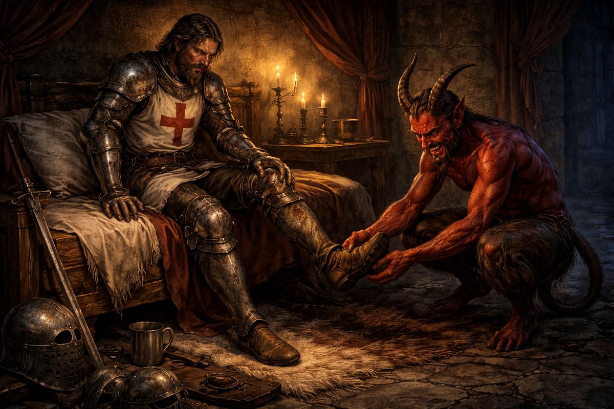 To nejlepší nakonec. Legenda o úslužném satanovi. Jeden z rytířů byl nestřídmý a sprostý. Když se vracel z večeře, volal na sluhu, aby mu zul boty, ale ten usnul, takže rytíř začal nadávat a zavolal si na pomoc satana. Ten úslužně přiskočil a zul mu boty - i s kůží. Rány mu začaly hnisat, trpěl a zemřel. Jeho smrt sloužila ostatní bratrům jako varovný příklad. Nevím, jestli je to úplně adekvátní trest, ale já o tom nerozhoduju.