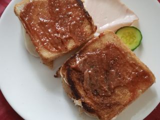 Talíř slouží jako základní stavební kámen, na který se vrství vejce, slanina, párky, losos, sýr, sýr na sýr, a pro jistotu ještě sýr. Někdo přidá zeleninu – aby to vypadalo zdravě – a vše korunuje croissantem, který se už nevejde, ale „byla by škoda ho tam nechat“.