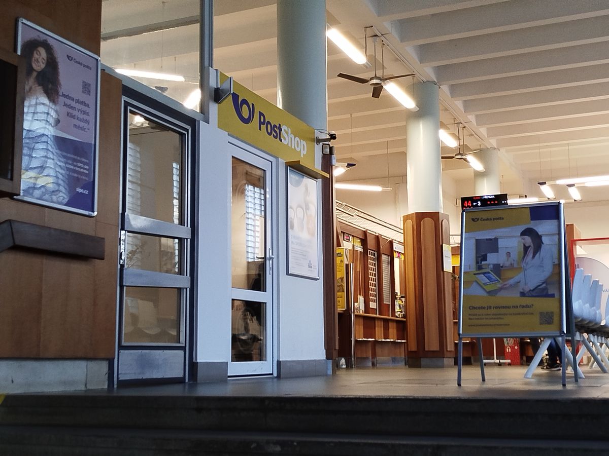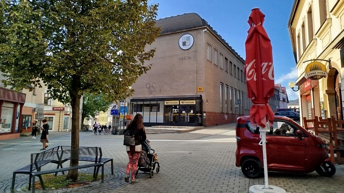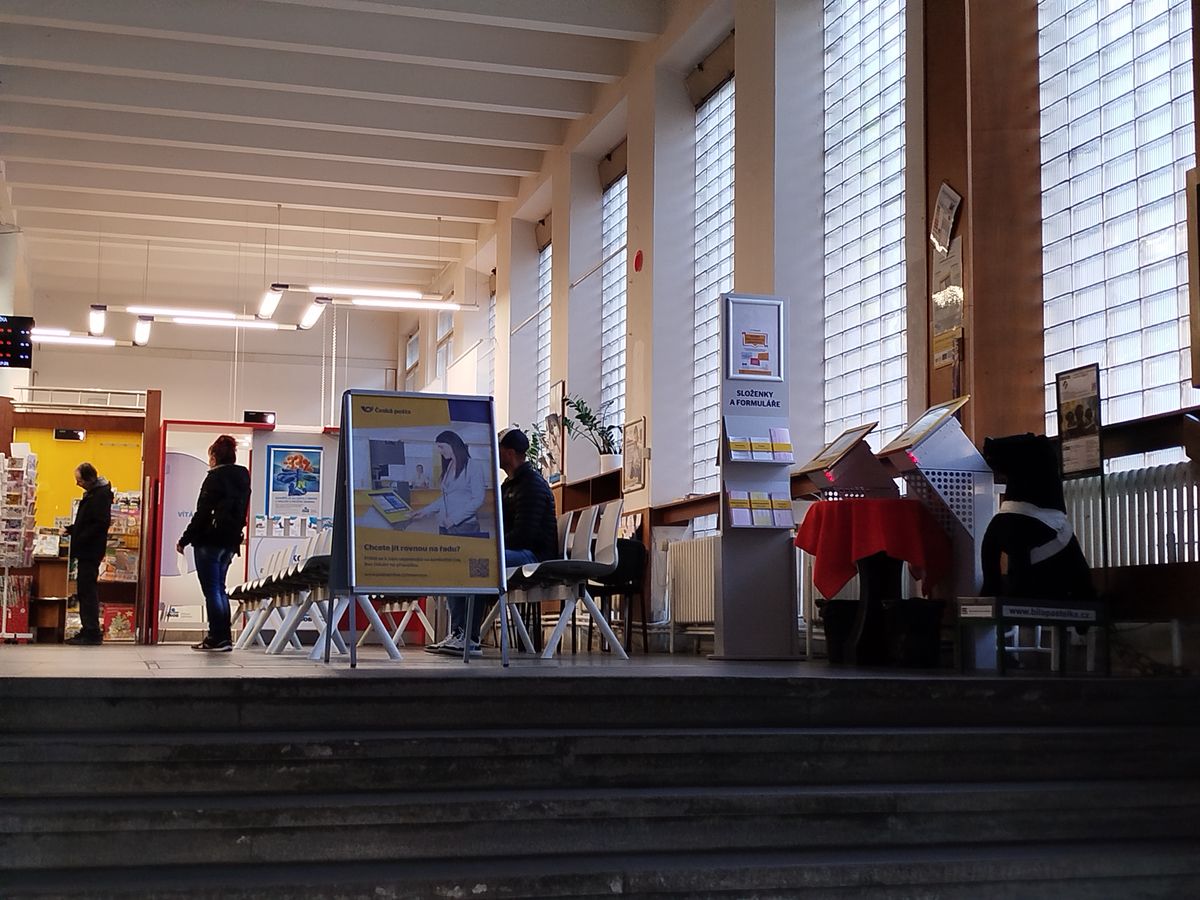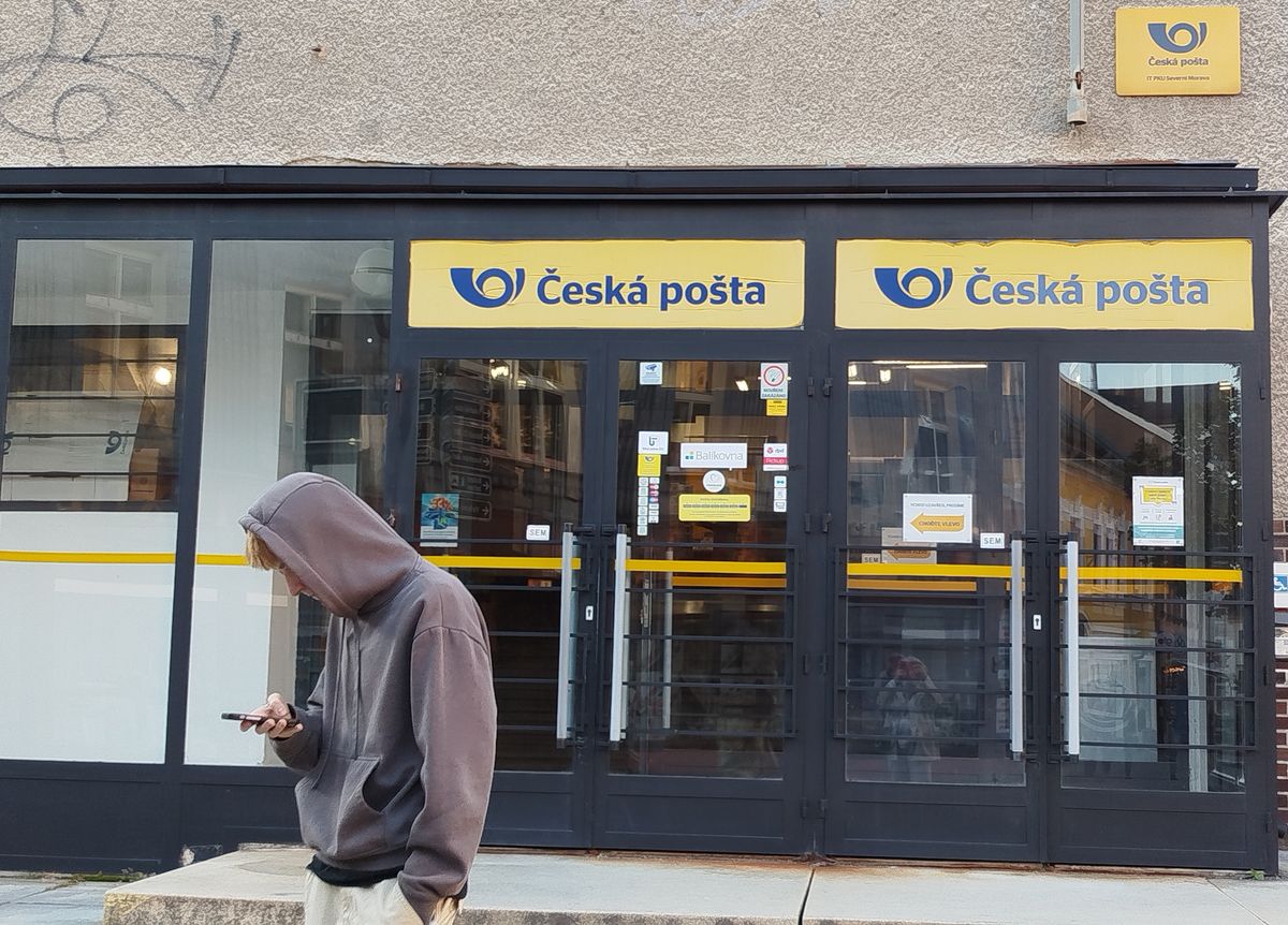Na fotografii je prosklený vstup do jediné pobočky České pošty v Šumperku, druhou pobočku v Temenici financuje město Šumperk.