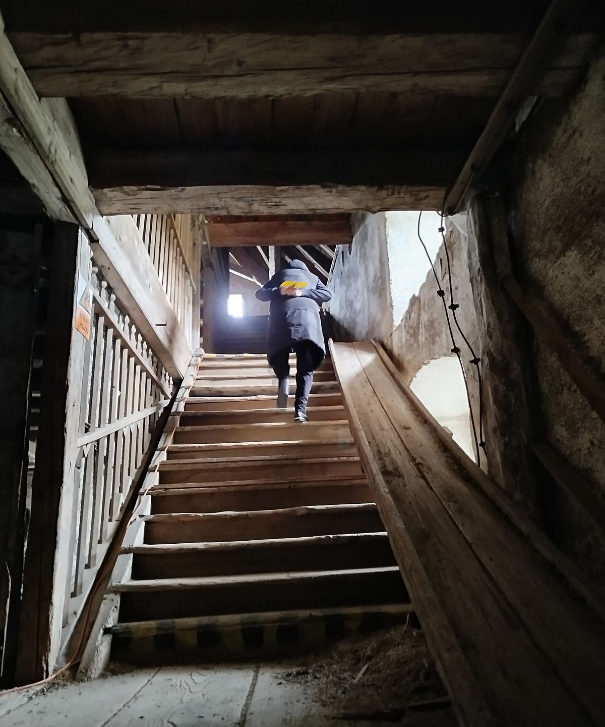 Vstupujeme do sýpky a po těchto dřevěných schodech si postupně prohlížíme tři patra ve zděné části sýpky a další tři patra v prostoru krovu.
