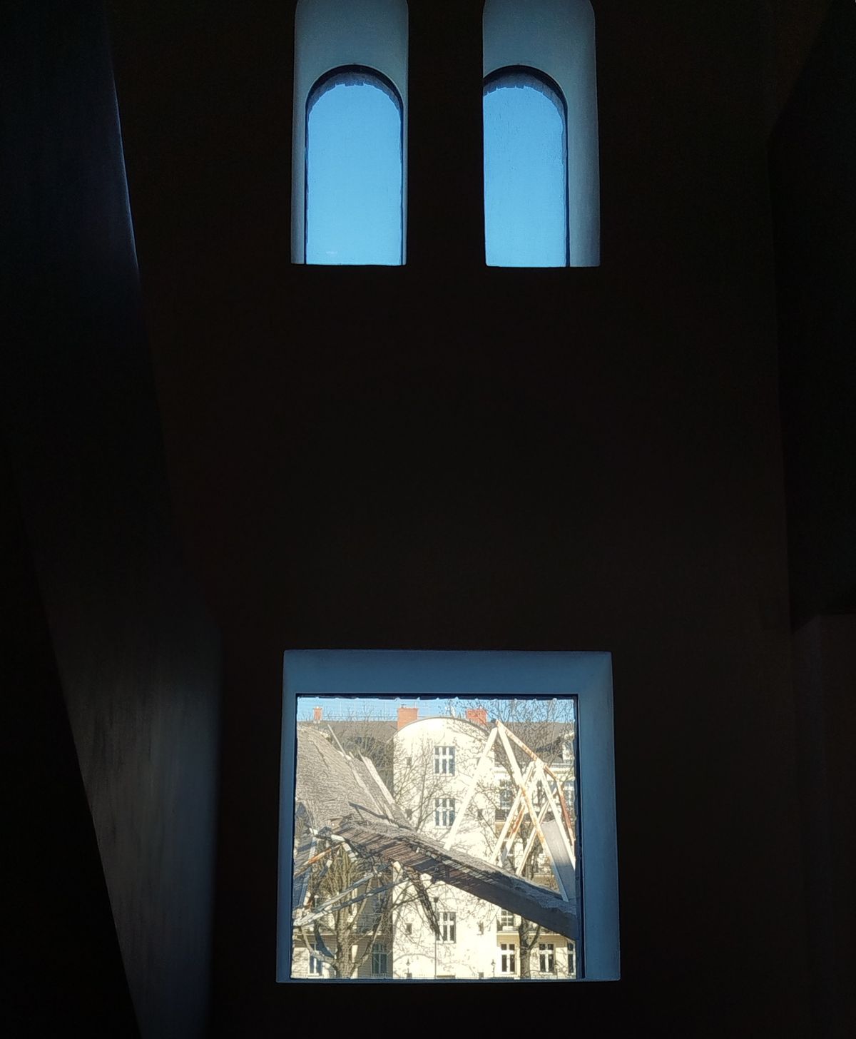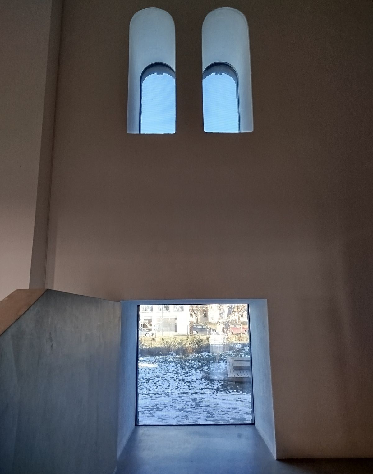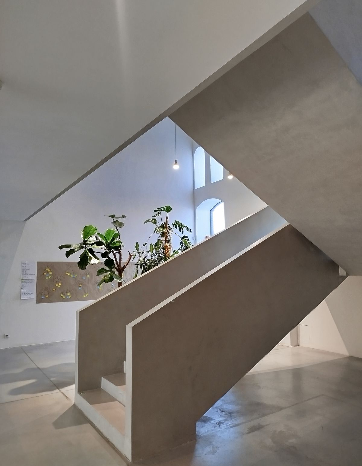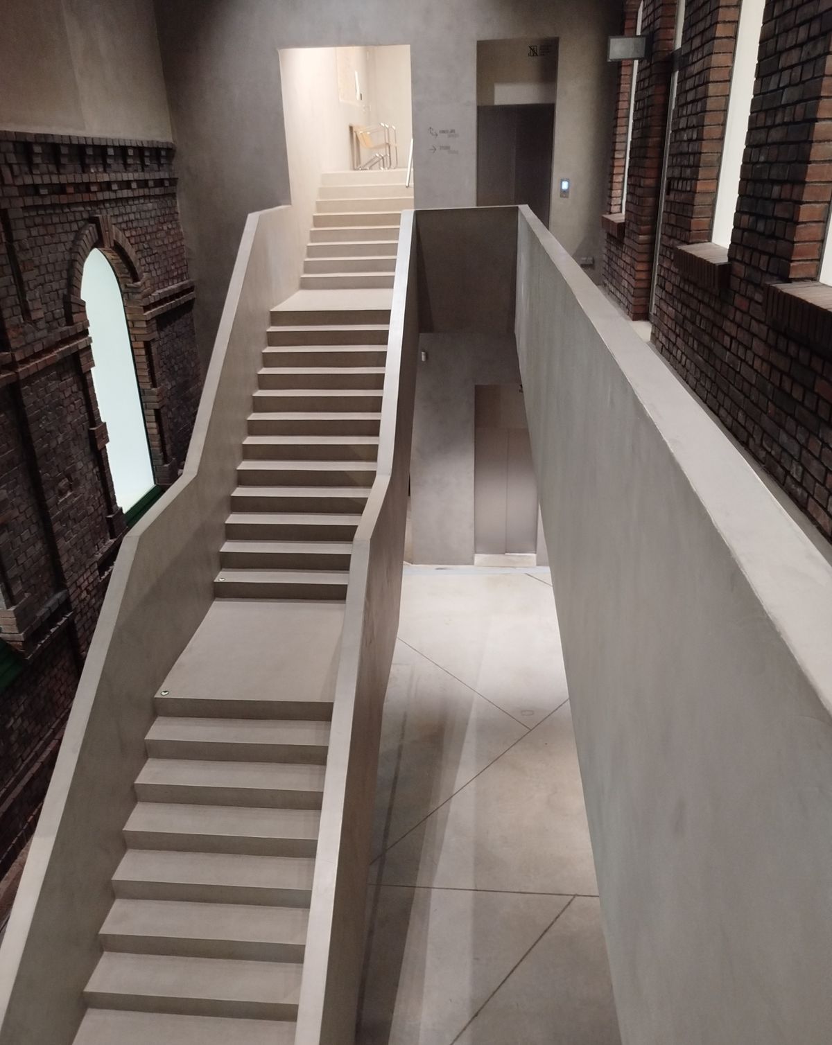 Po monumentálních betonových schodech uprostřed vstupují zaměstnanci galerie do obslužných prostor a kanceláří.