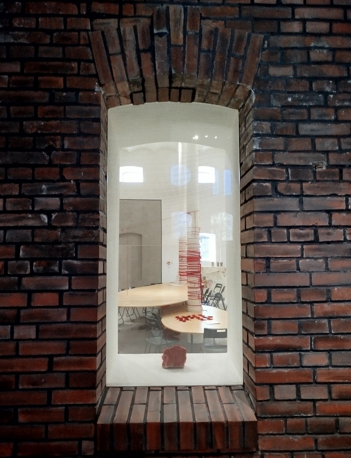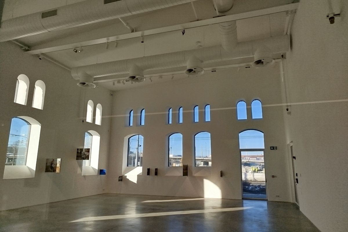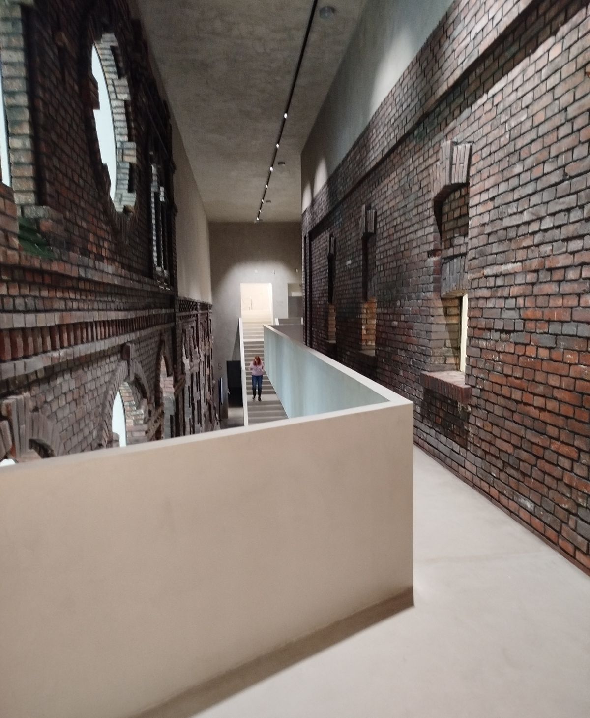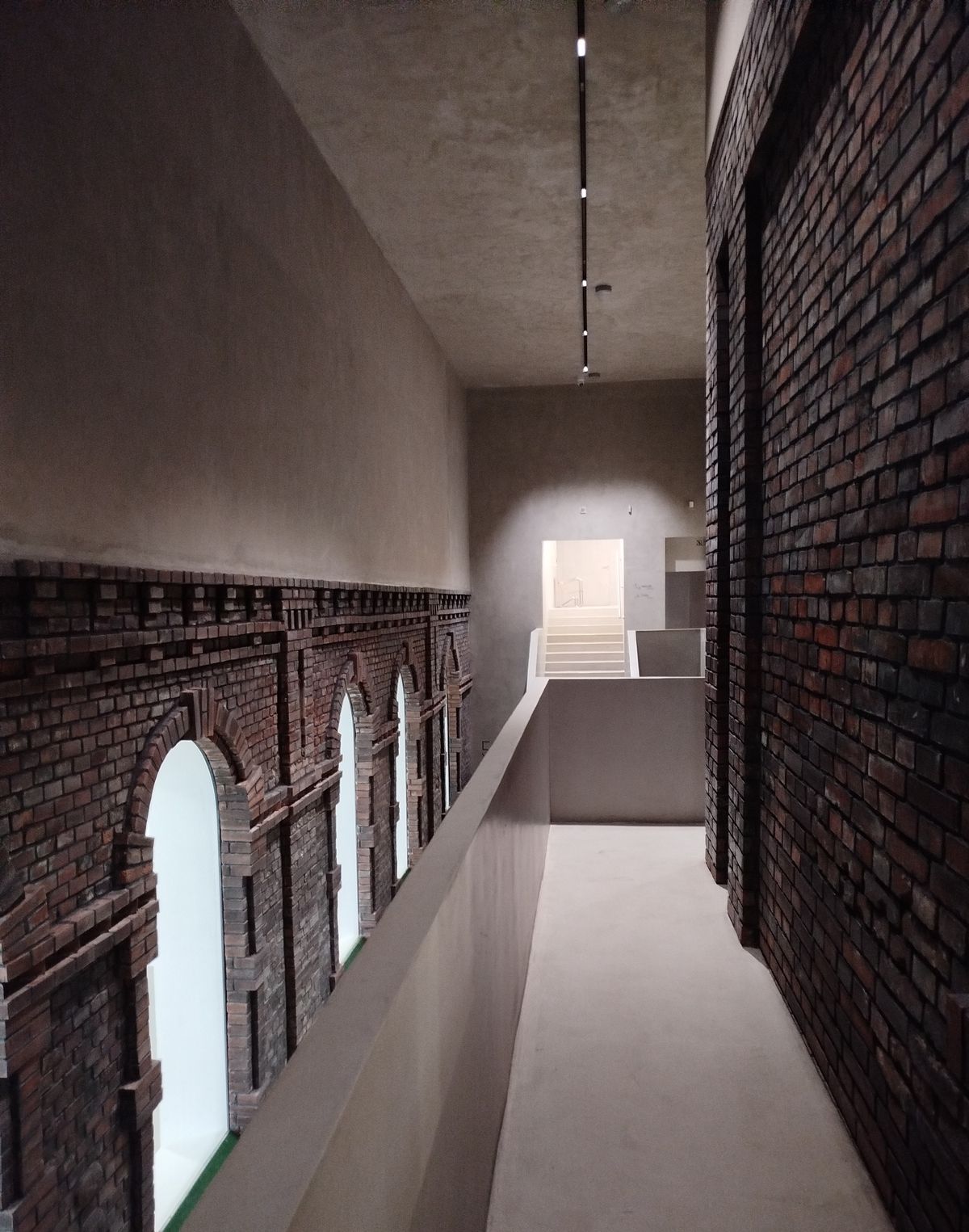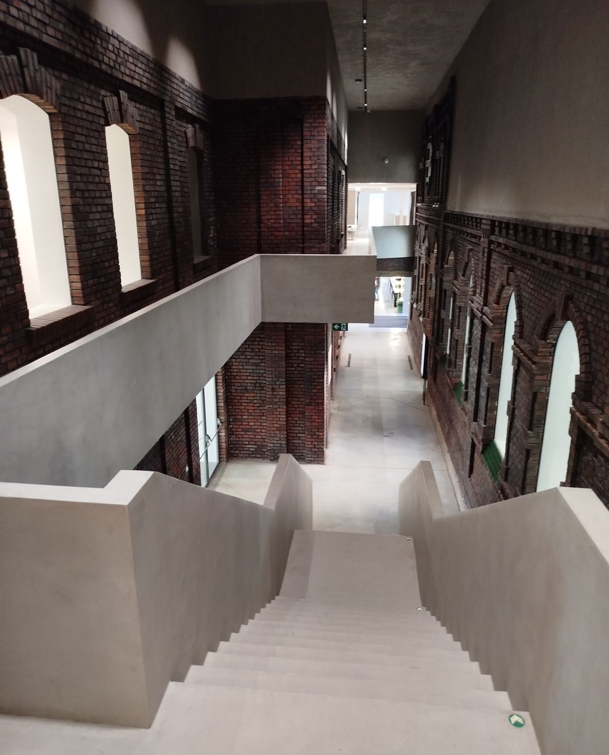 Pokud vystoupáte do prvního patra budovy, otevře se před vámi také tento unikátně řešený a realizovaný prostor kombinující staré a zašlé cihlové zdivo se zachovanými otvory oken a vstupů s vestavěnými jednoduchými galeriemi a schodišti, viz další fotografie níže.