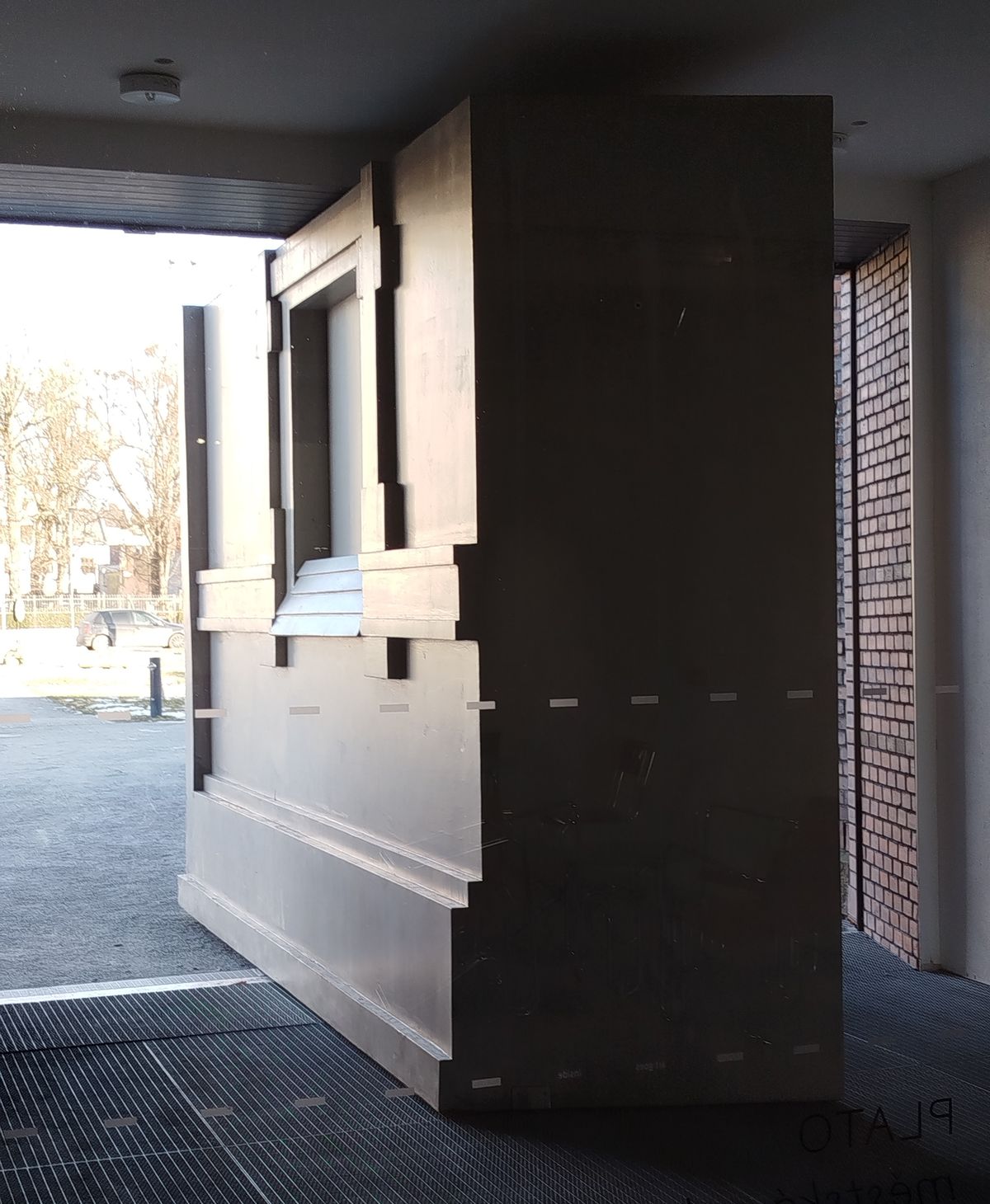 Před budovou PLATO stojí prostorová instalace Stín Bauhausu odkazující na bývalé sídlo galerie v pozdější prodejně Bauhaus hned vedle. Tato budova byla nedávno zbourána, místo ní se staví Justiční palác.