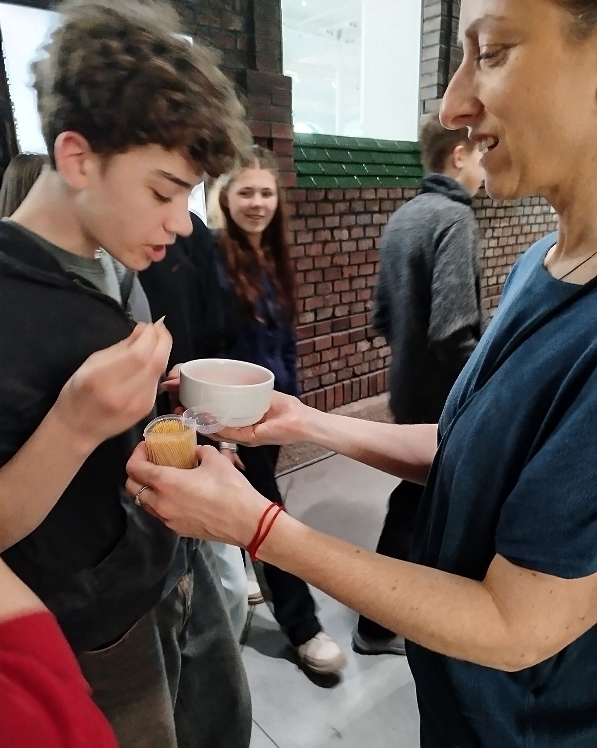 Během prohlídky galerie jsme potkali skupinu studentů s místní lektorkou. Ta jim právě nabízela v rámci prohlídky výstav spojených s gastronomií v galerii ochutnávku růžových plátků zázvoru ve sladkokyselém nálevu s odkazem na japonskou kuchyni a zejména sushi.