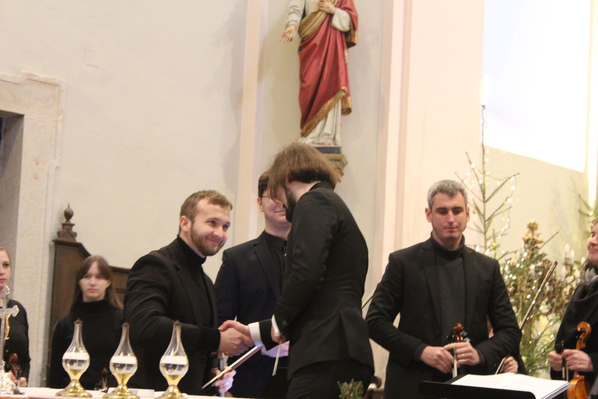 Dirigent František Dvořák se vítá s hráčem prvních houslí Zábřežského komorního orchestru.