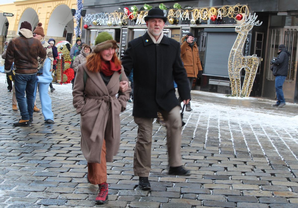 Mašírujem si to přes Dolní náměstí v Olomouci s věží radnice, odkud jsme vyrazili, v pozadí.