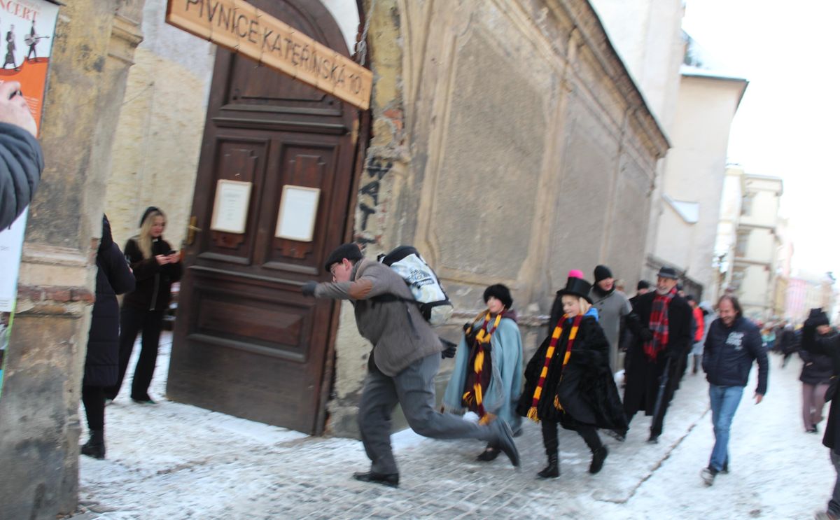 Aaaaah, klouže to. Ostrou zatáčkou zamíříme do Hospody v Kateřinské ulici 10. První chodci upozorní hudební skupinu na podiu, že má začít hrát.