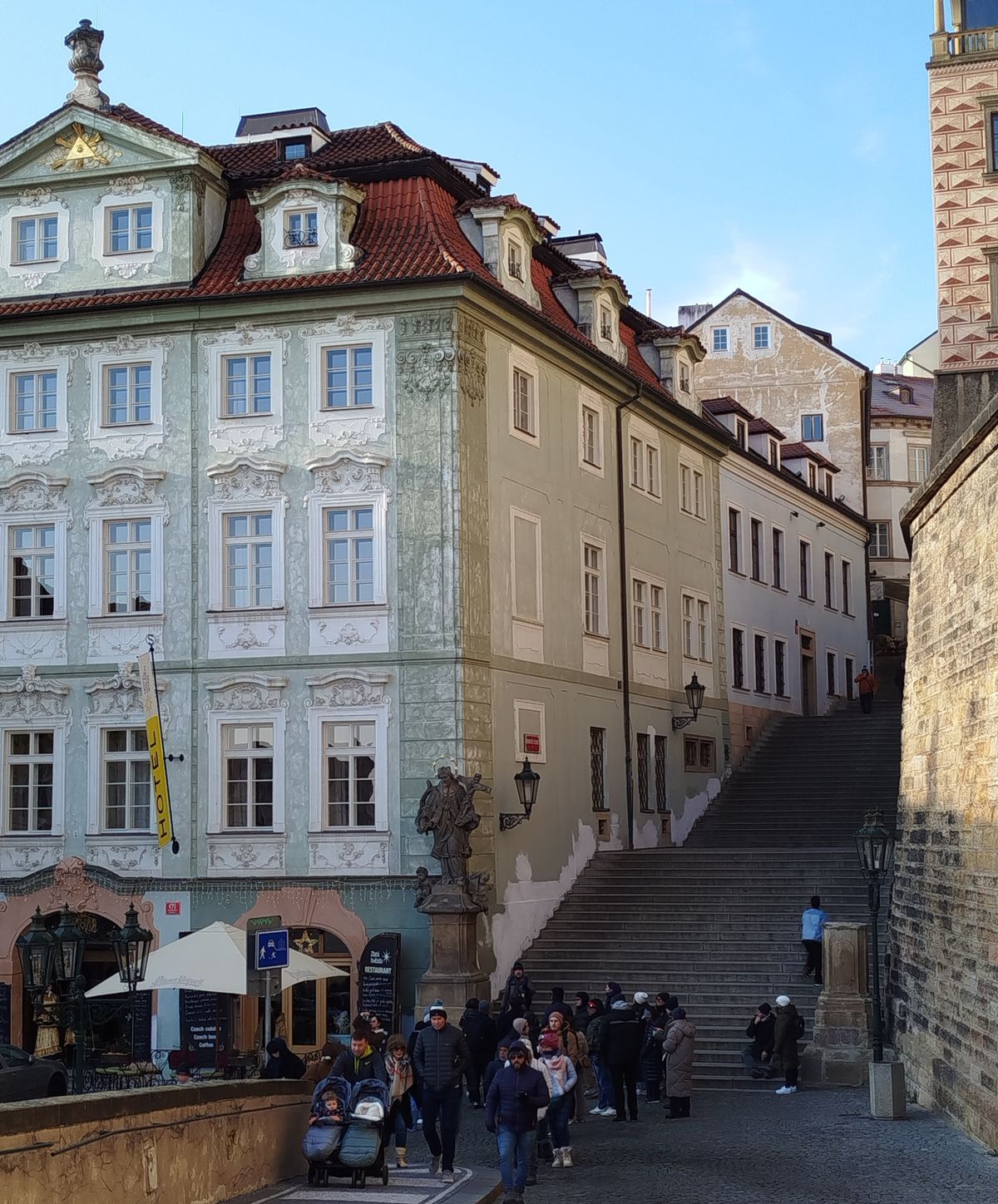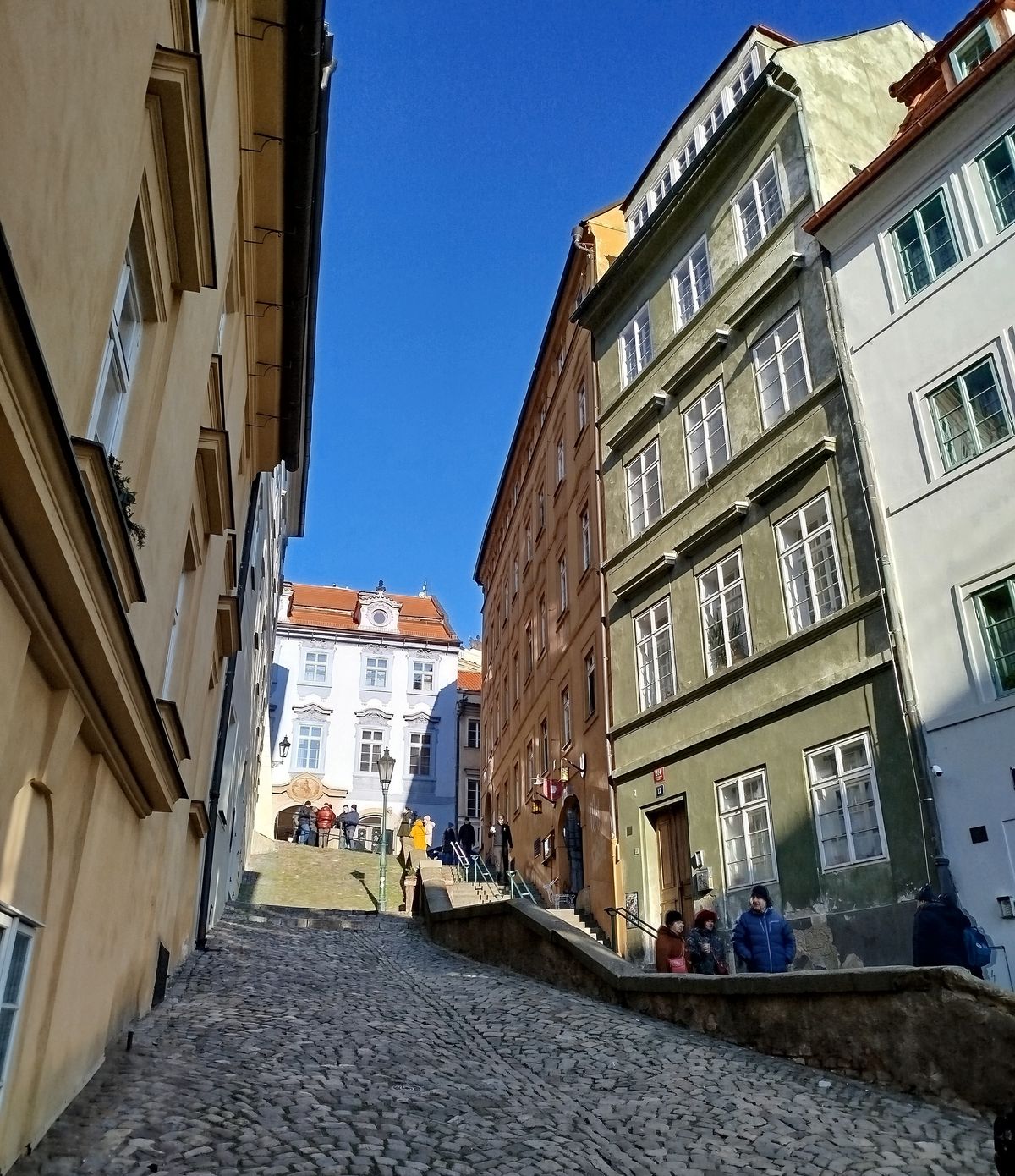 Radniční schody na dolní fotografii zatáčí strmě vzhůru od vrcholu Nerudovy ulice s několika odpočivadly až na Hradčanské náměstí, jejich dolní částí zároveň vede hranice mezi Hradčany a Malou Stranou. Schodiště je dlouhé asi 100 metrů a jeho 127 schodů překonává výškový rozdíl asi 30 metrů. Název získalo v roce 1870 podle Hradčanské radnice, ta stojí v jejich horní části. Doporučuji si projít toto malebné pražské zákoutí, schody vedou částečně pod historickou hradčanskou zástavbou.