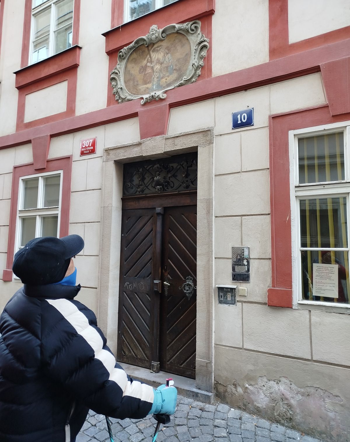Na nároží domu je historický nápis v němčině a češtině: Wälsche Spital G. / U Vlašského špitálu / 348-3.