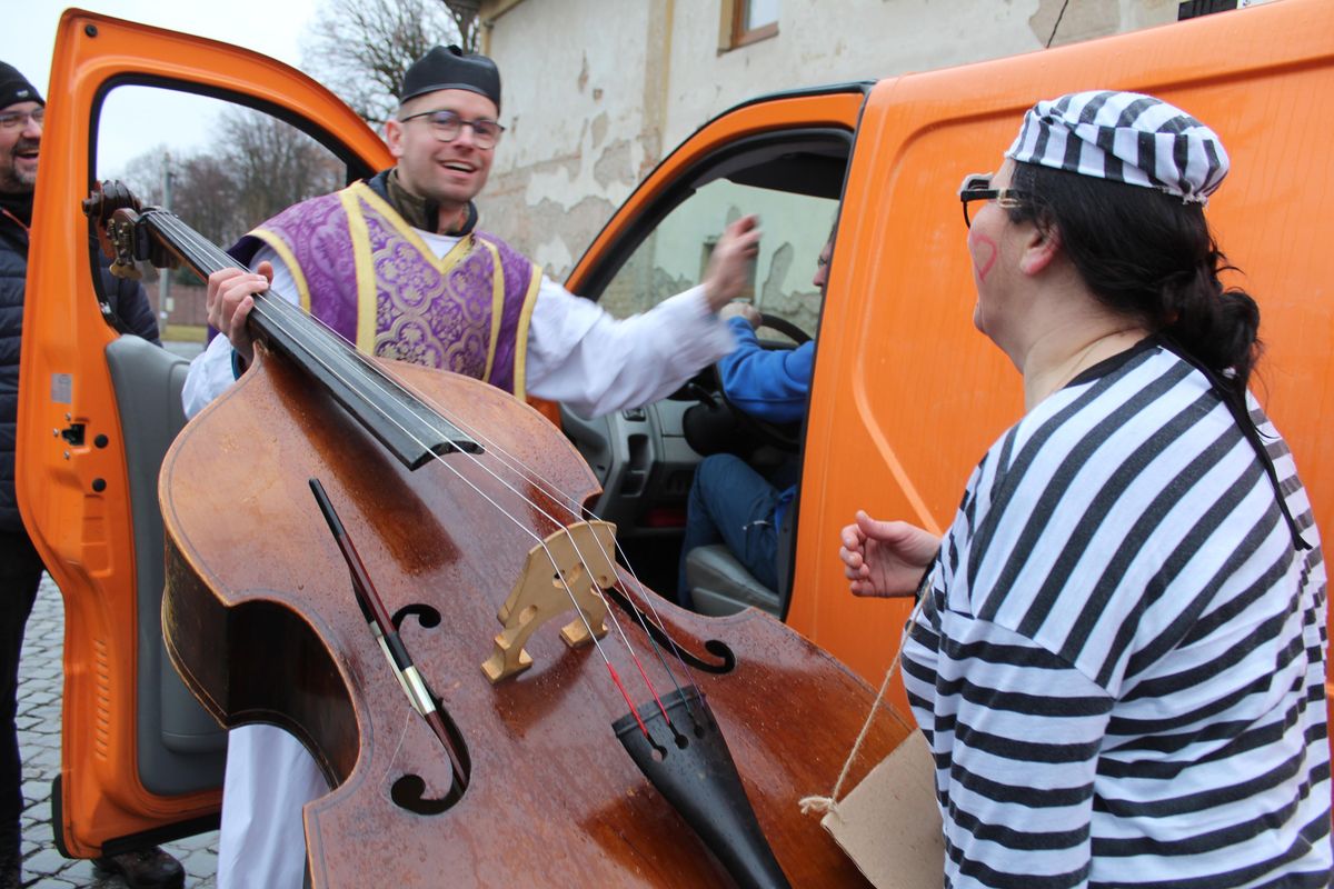Cestou vesnicí stále více prší a prší. Po zastavení na místním hřišti, kde je nám nabídnuto také bohaté občerstvení, se vydáme všichni do místní hospody, do tepla. Mezitím potkáváme dodávku, basa se prý potřebuje ohřát, a tak ji basista cpe zadními dveřmi do vozu. Spolu s basou se ve voze chvilku ohřejí také již notně rozdovádění účastníci masopustního veselí.