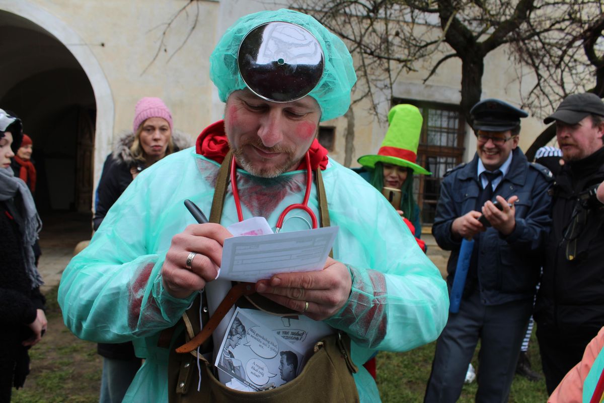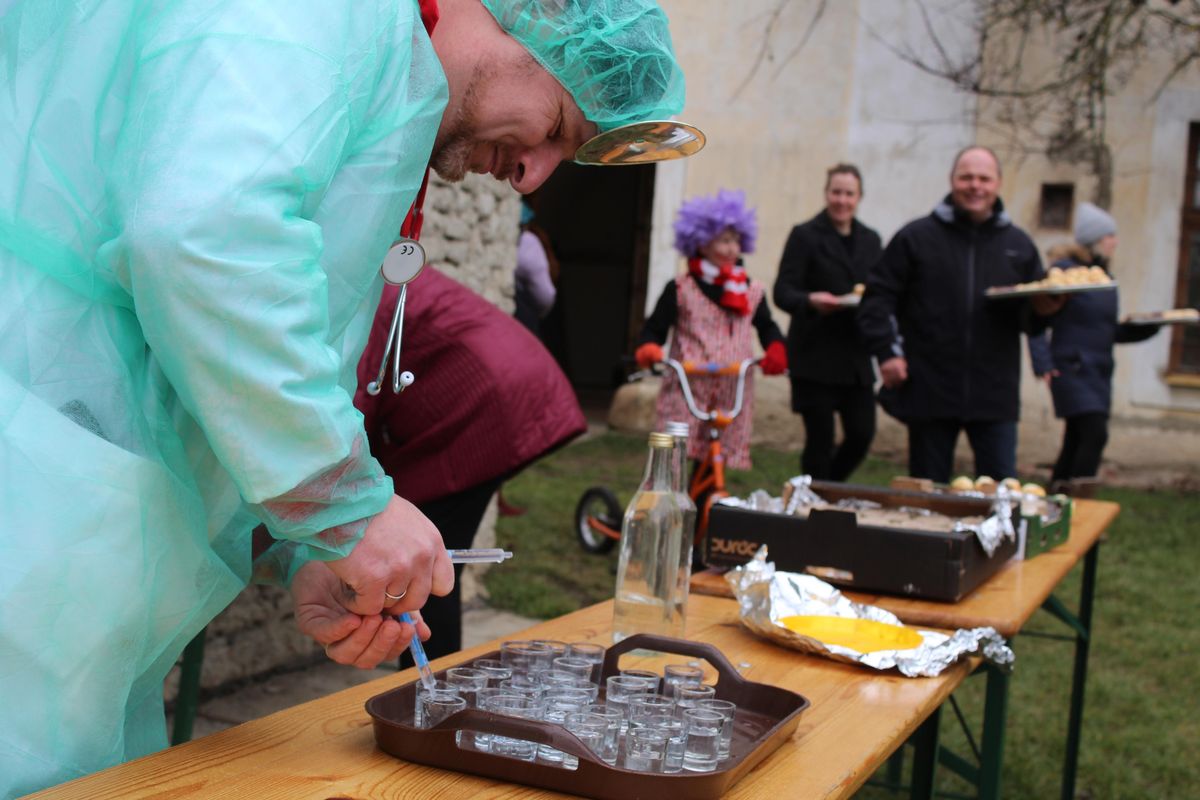 Tohoto pána jsem již potkala při focení masopustu v Příkazech. Dnes s manželkou vytvořili masku dvou zdravotníků ve slušivých oděvech z operačního sálu. Oba byli pro nás velmi potřební. Čekaly nás stříkačky naplněné nejen domácí slivovicí.