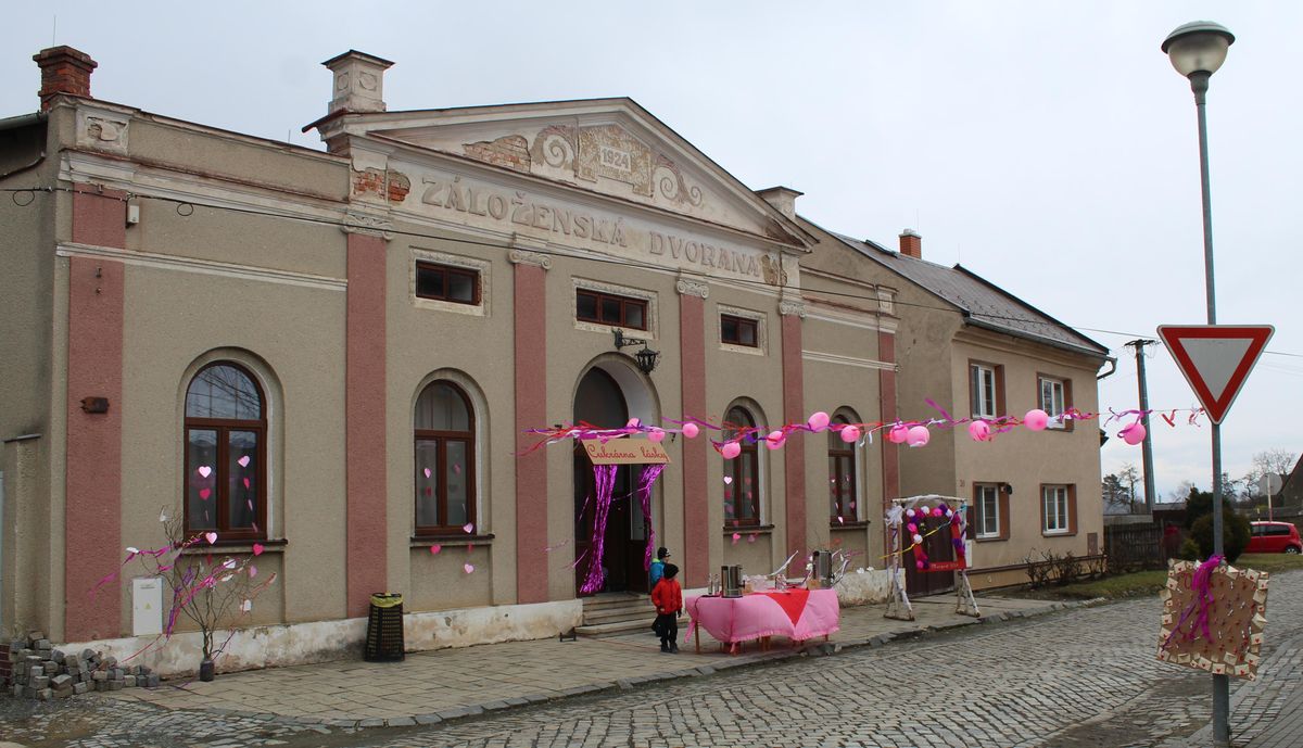 Záloženská dvorana v Cholině byla postavena v roce 1924, právě se připravuje přijmout a bohatě pohostit masopustní průvod.