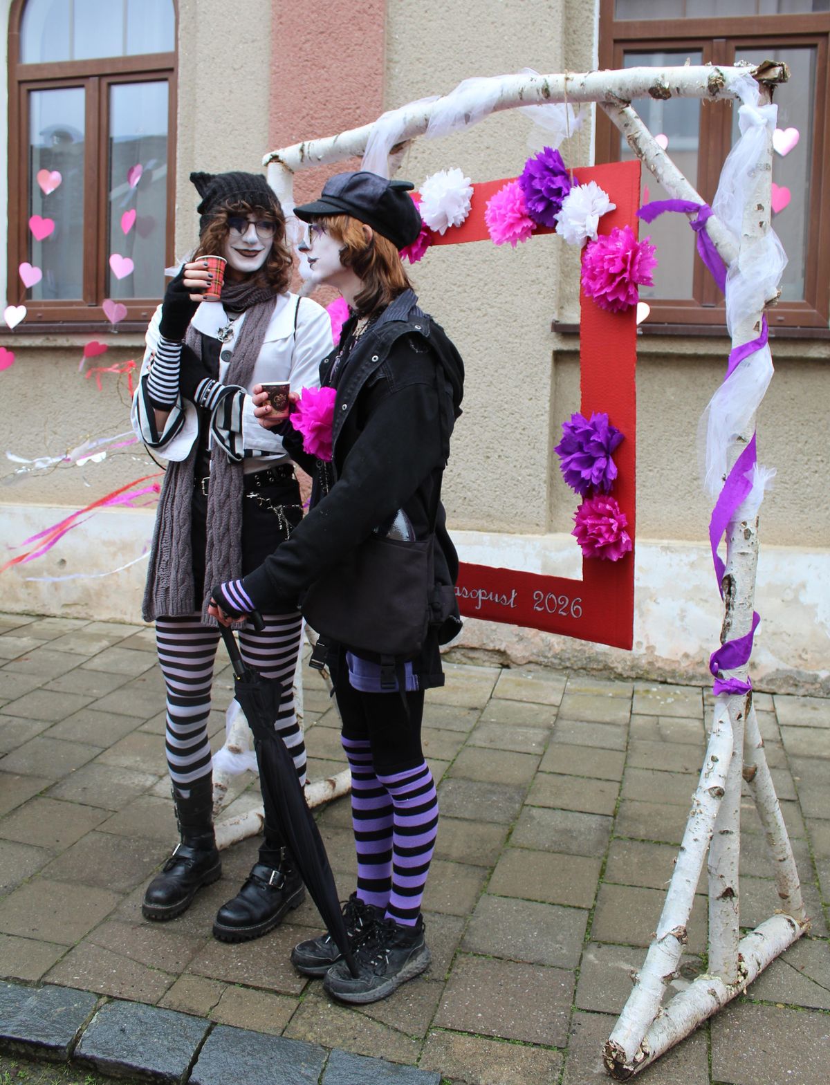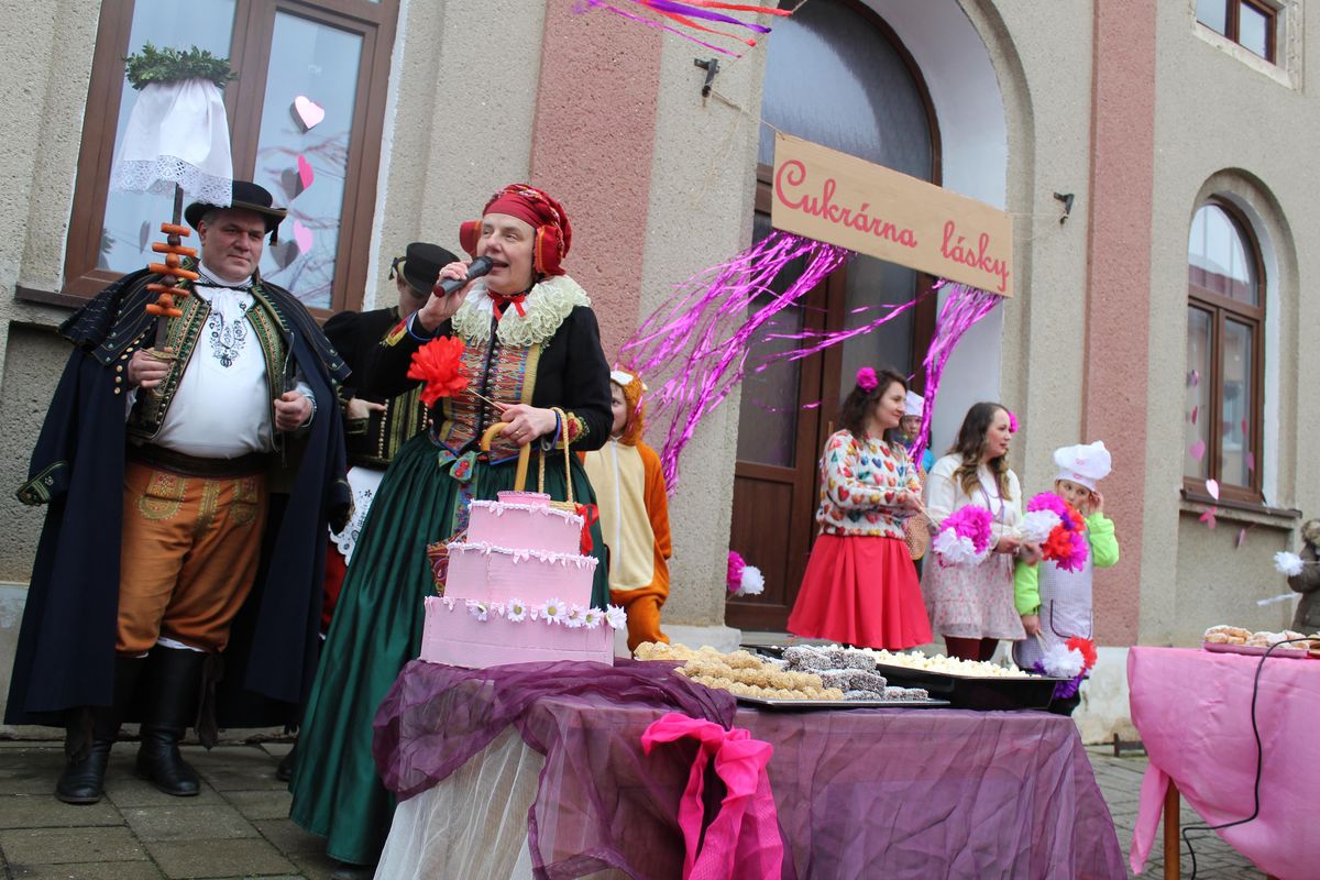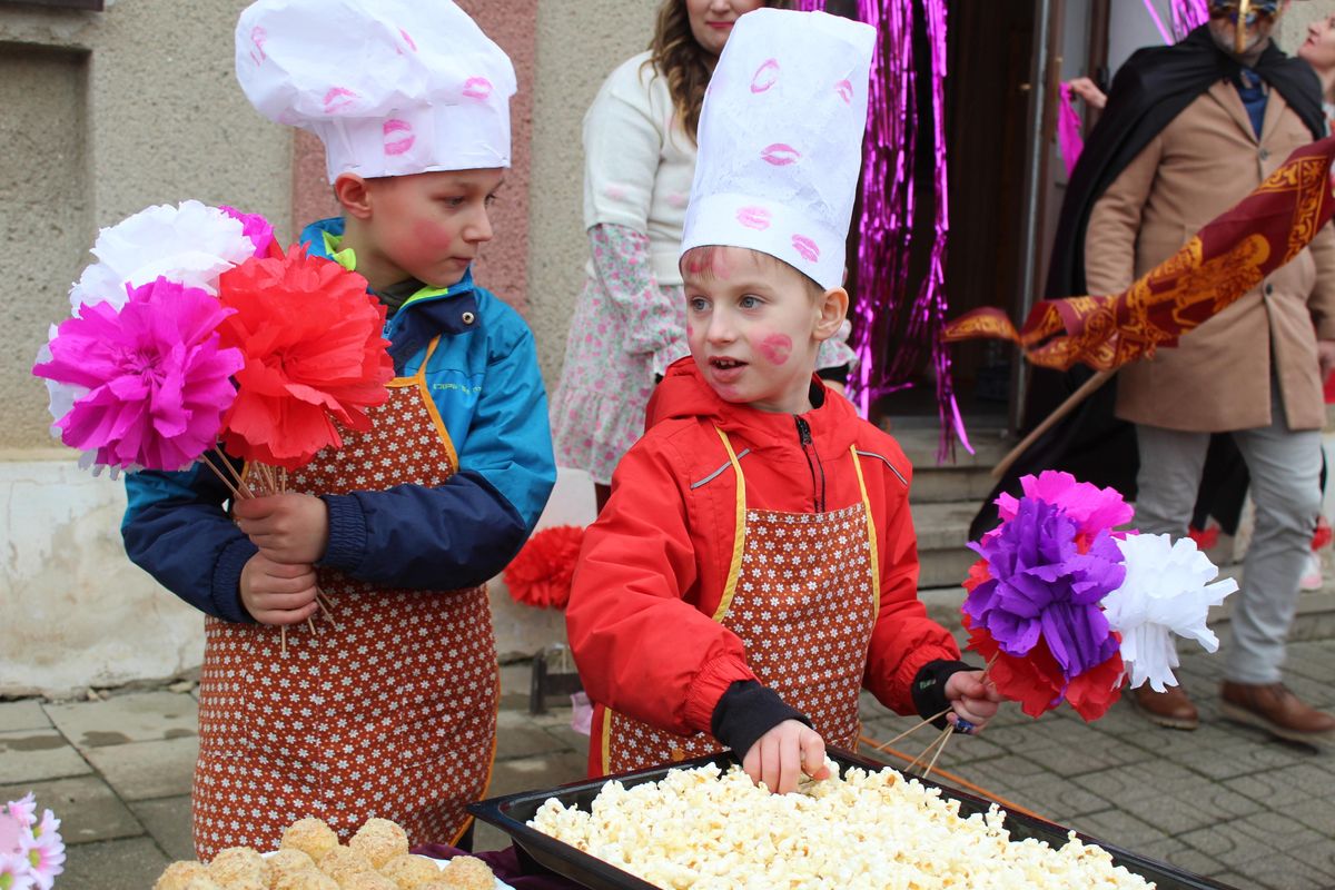Před Kulturním domem nám dvě maminky, sestry, se svými dětmi, vytvořily stylovou Kavárnu lásky. Masopust v Cholině slavili v sobotu 14. února, tedy na Den svatého Valentýna. Napekly dobroty, nachystaly punč a horký čaj, vytvořily s dětmi barevné růže z krepového papíru, děti nám je pak s úsměvem rozdaly.