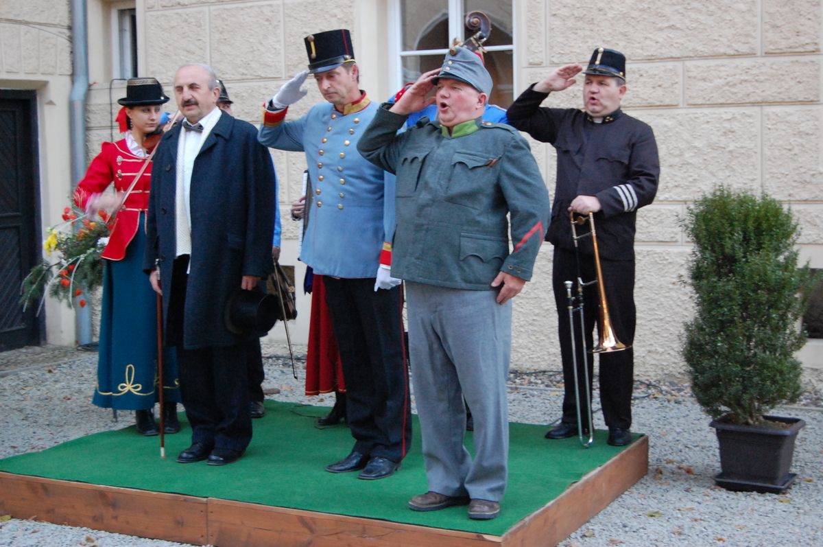 Přibližně v polovině trasy mezi Karlovými Vary a Rakovníkem leží obec Chyše, jejíž ozdobou je zámek – sídlo hraběcího rodu Lažanských. Právě tady jsem 27. října roku 2010 fotil „oslavnou tryznu za konec monarchie“. Jako vrchní velitel rakousko-uherských vojsk tu na nádvoří zámku slavnostně napochodoval za zvuků parádemarše Josef Švejk, který přerostl v univerzální postavu jako harlekýn, pierot anebo Enšpígl. Pan obršt Lažanský v bílých rukavičkách a parádní uniformě, zapůjčené z Barrandova jako zhmotnění aristokratické habsburské tradice napochodoval s Josefem Švejkem, zahrála se slavná rakouská hymna „Zachovej nám Hospodine císaře a naši zem,“ zazněla čestná salva, a řečníci prokládali věty německými termíny jako „Hab acht, Meine Herr,“ a podobně.