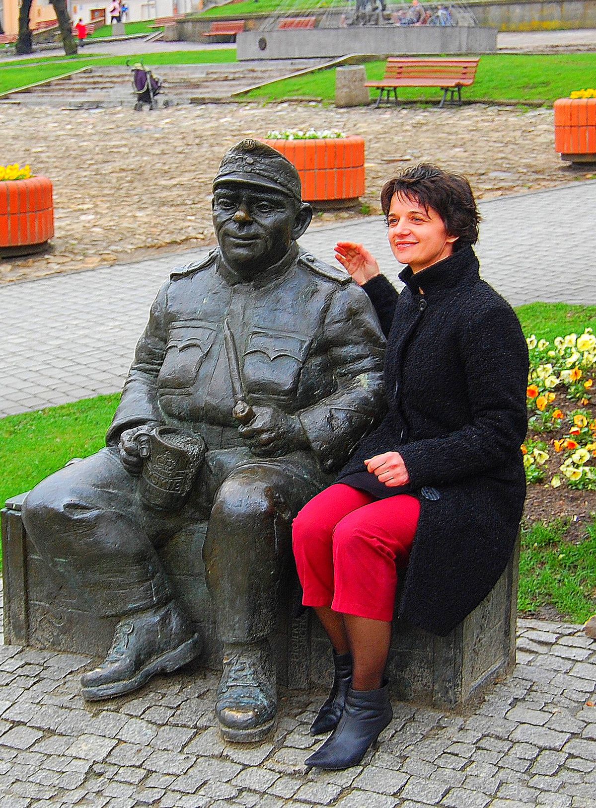 Když jsem v polské Haliči putoval po stopách pradědy z první světové války, narazil jsem na Švejka poprvé v Přemyšlu, kdysi slavné vojenské pevnosti, dnes příjemném městě. Procházel jsem město s dvěma Polkami, které měly ubytování ve stejném hostelu jako já a všimli jsme si Švejkovy ulice i sochy na lavičce v centru „Švejk je u vás populární?“ zeptal jsem se. „Bardzo popularny,“ řekly obě. V Přemyšli to platilo určitě, měl ohmataný nos od toho, jak si na něj lidé sahají pro štěstí, a neustále se okolo něj fotily skupinky dětí i s rodiči a my jsme se také vyfotili. Ale hlavně to nebyl ten náš Švejk s úsměvem od ucha k uchu, ale vážný, zamyšlený muž s výrazem, jaký se dává státníkům, kterým leží na bedrech osud světa.