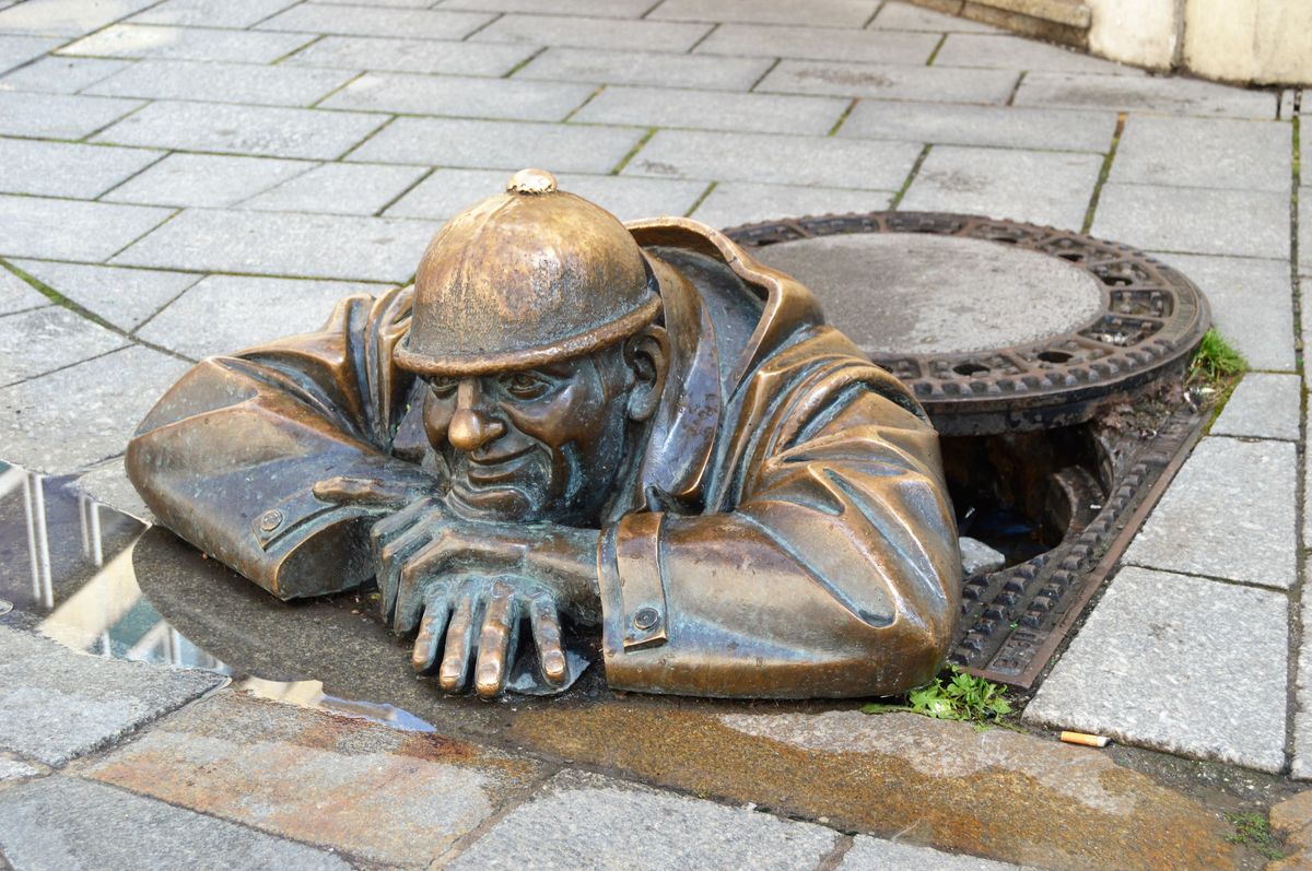 Bronzová socha Čumila je jednou z nejnovějších bratislavských legend či atrakcí. Když jsem k ní poprvé přišel, zastihl jsem dvojici dětí, sedících na té bronzové soše chlapíka, který vystrkuje hlavu z kanálu, zvědavě pozoruje cvrkot v ulicích a je prý snad nejfotografovanější v Bratislavě. Je to socha poměrně mladá, z roku 1997, jejím autorem je akademický malíř, sochař a výtvarník Viktor Hulík a vyfotit si ji můžete na strategicky dobře zvolené poloze: křižovatce Rybárskej brány s Panskou a Laurinskou ulicí. Případně i přidat nějakou zajímavou „čumilskou“ historku, kterých je už beztak hodně: třeba že se schovává před sovětskými tanky v roce 1968, anebo dokonce za bombardování během druhé světové.