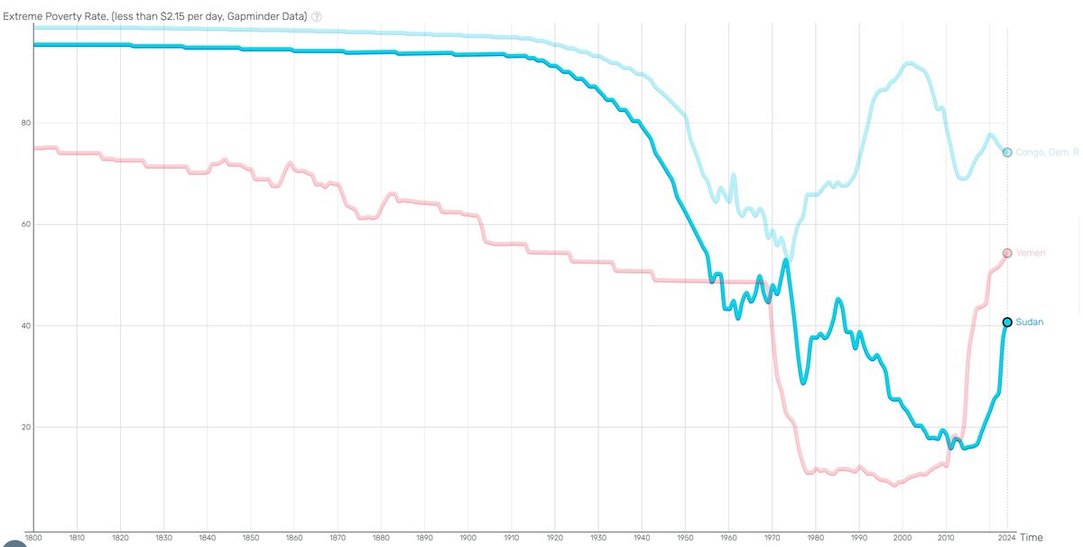 Druhá skutečnost je, že tento dlouhodobý pokles se v tuto chvíli dost možná zastaví nebo zbrzdí, protože v současnosti žije čím dál větší procento extrémně chudých v oblastech zasažených konflikty - jako je například Súdán nebo Jemen. A v době konfliktu je velmi obtížné snižovat chudobu nebo doručovat do takových regionů pomoc.