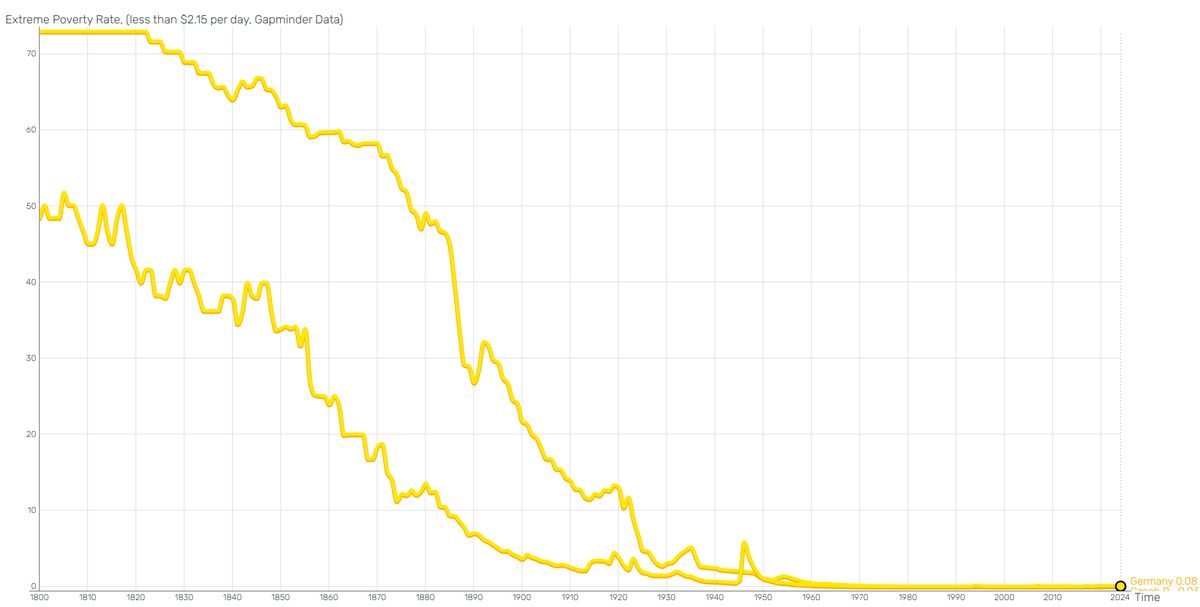 Jaký je historický vývoj extrémní chudoby? Do počátku 19. století životní úroveň lidstva stagnovala. A na začátku tohoto století žilo v podmínkách extrémní chudoby více než 80 % lidstva. Se změnami směrem ke svobodné společnosti a kapitalismu tyto procenta v následujících dekádách klesaly. Na následujícím grafu je vidět vývoj procenta obyvatel v extrémní chudobě na území dnešního Česka a v Německu (historická data jsou přepočtena na současnou kupní sílu). Vidíme, že dle odhadu na začátku 19. století žilo více jak 75% Čechů v situaci extrémní chudoby. V Německu bylo toto procento výrazně nižší. A pokud bychom měli v grafu i Velkou Británii - hvězdnou ekonomiku v tomto období - tak tam by byl podíl extrémně chudých ještě nižší. Někdy od roku 1960 žije v Česku v podmínkách extrémní chudoby jen promile obyvatel.
