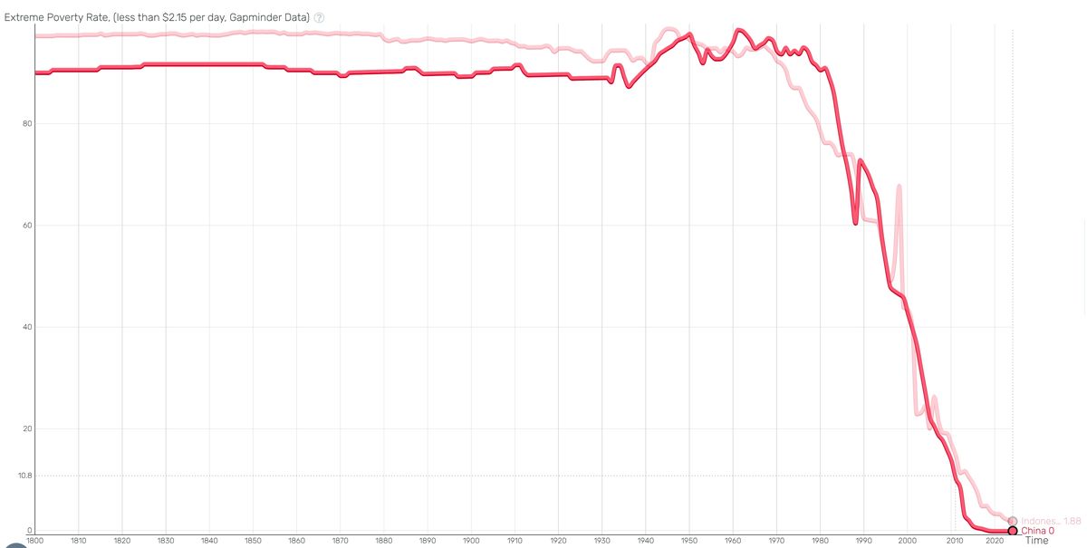 Za tímto pozitivním vývoje je zlepšení v zemích jako Čína, Indonésie, Vietnam nebo Indie, kde extrémní chudoba prudce poklesla, jak můžeme vidět na následujícím grafu. Čína dokonce tvrdí, že extrémní chudobu zcela eliminovala. Bez ohledu na dosažení nebo nedosažení této mety se jedná nepochybně o velmi úspěšný vývoj.