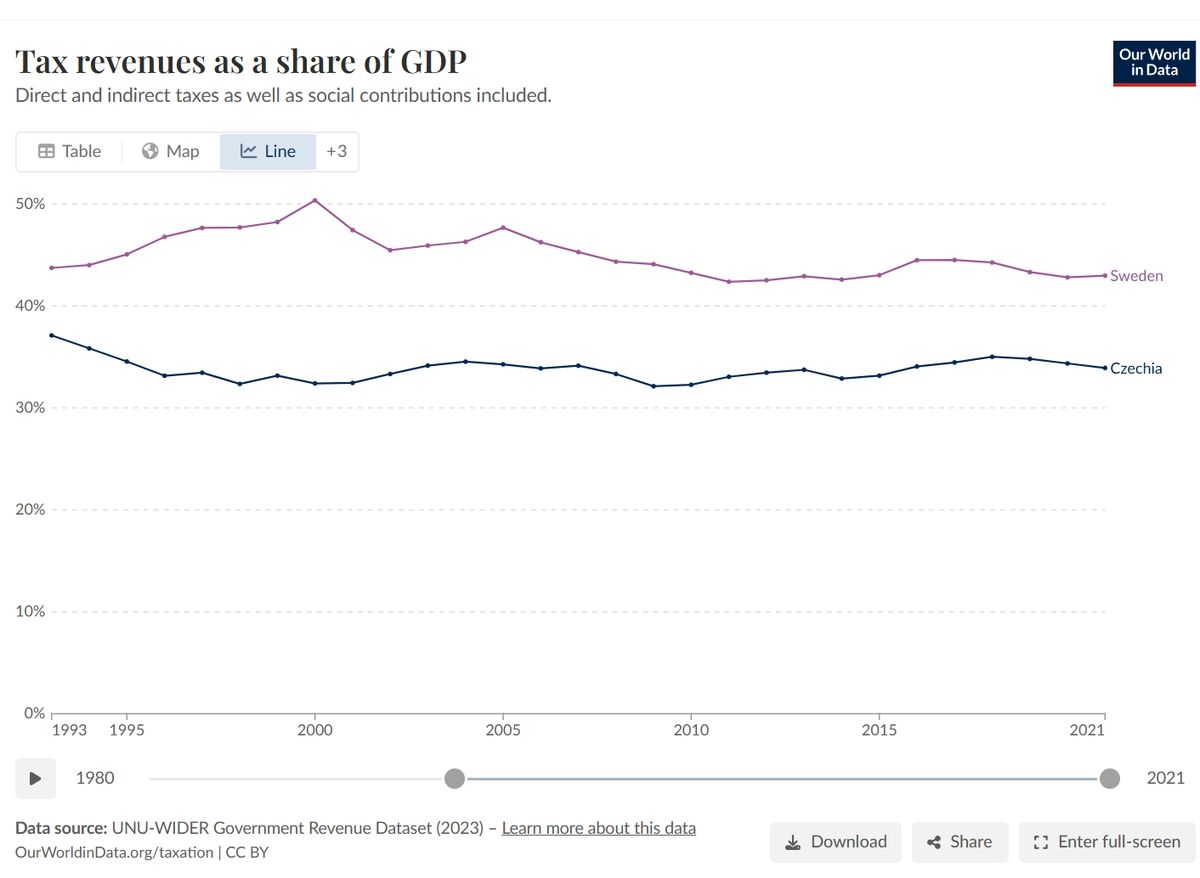 Navíc myslím, že u nás vnímáme pouze vybrané aspekty švédského modelu, a to ještě hodně zprostředkovaně a idealizovaně. Ve Švédsku se totiž odehrává něco, o čem většina Čechů nechce vůbec slyšet - platí se daně. Už to není, co bývalo, ale rozdíl je pořád docela velký - viz níže graf daňových příjmů. Obecně Švédi dlouhodobě volili strany, které usilovaly o větší přerozdělování. Vzpomínám si na výzkum veřejného mínění ve Švédsku na počátku 90. let, kdy byla míra jejich vládního přerozdělování opravdu vysoká. Dotaz zněl: „chcete, aby švédský stát více přerozděloval i v situaci, kdy se vám osobně zvýší daně?“ A většina Švédů souhlasila. Dal bych to do kontrastu se snahou podstatné části české populace, která usiluje o to daně pokud možno vůbec neplatit, nebo je snížit anebo aspoň zavést Švarcsystém. :-) Neumím si představit, že by podobný výzkum dopadl stejně i v Česku.
