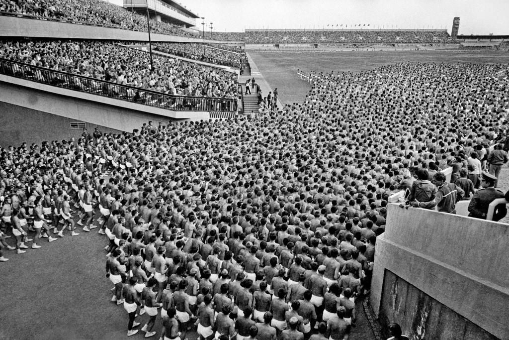 Všichni museli nacvičovat dlouhé měsíce, aby utvořili obří synchronní show na oslavu režimu. Připomínalo to do určité míry staré sokolské slety: opět moře lidských těl v jednotě pohybu. Ale něco bylo jinak. Možná ta hudba – místo sokolských pochodů zněly budovatelské písně. Možná výrazy ve tvářích cvičenců.