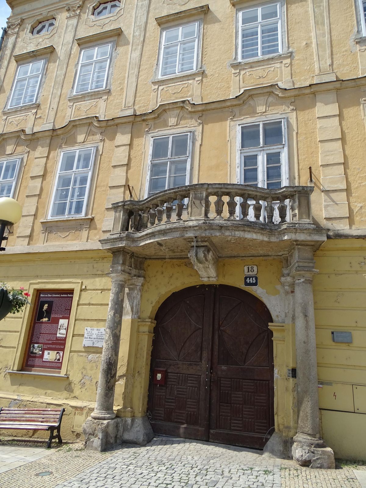 V tomto domě číslo 18 na dnešním Masarykově náměstí ve Znojmě pobývala v letech 1851 až 1853 se svým manželem Marie von Ebner Eschenbachová. Tuto skutečnost dnes připomíná pamětní deska a informační tabule.