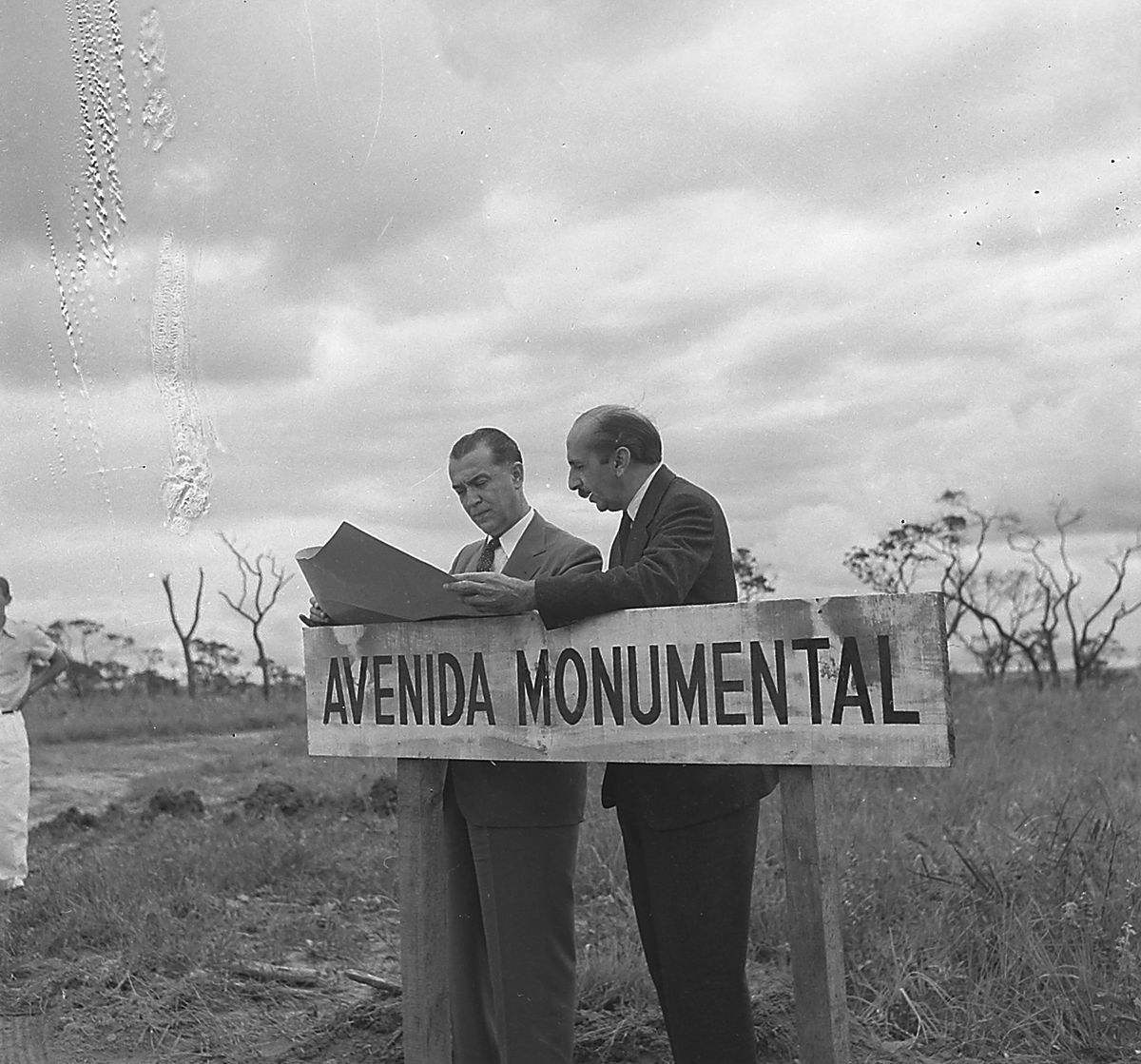 Juscelino Kubitschek (vlevo) roku 1957 ve vznikajícím novém hlavním brazilském městě Brasília, které bylo budováno v letech 1956 až 1960. Až do slavnostního otevření města Brasília roku 1960 bylo hlavním městem Brazílie Rio de Janeiro. Od roku 1987 je Brasília zařazena na seznam UNESCO.