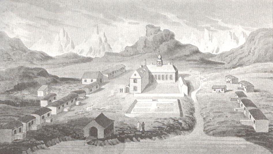 Osada Ny Herrnhut v Grónsku (dnes Noorliit), kterou založil moravský bratr Kristián David v roce 1733.
