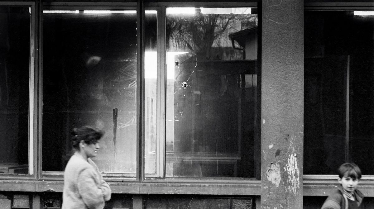Momentka jedné ze sarajevských ulice na přelomu zimy 1992/1993. Všimněte si pozůstatku po střelách.