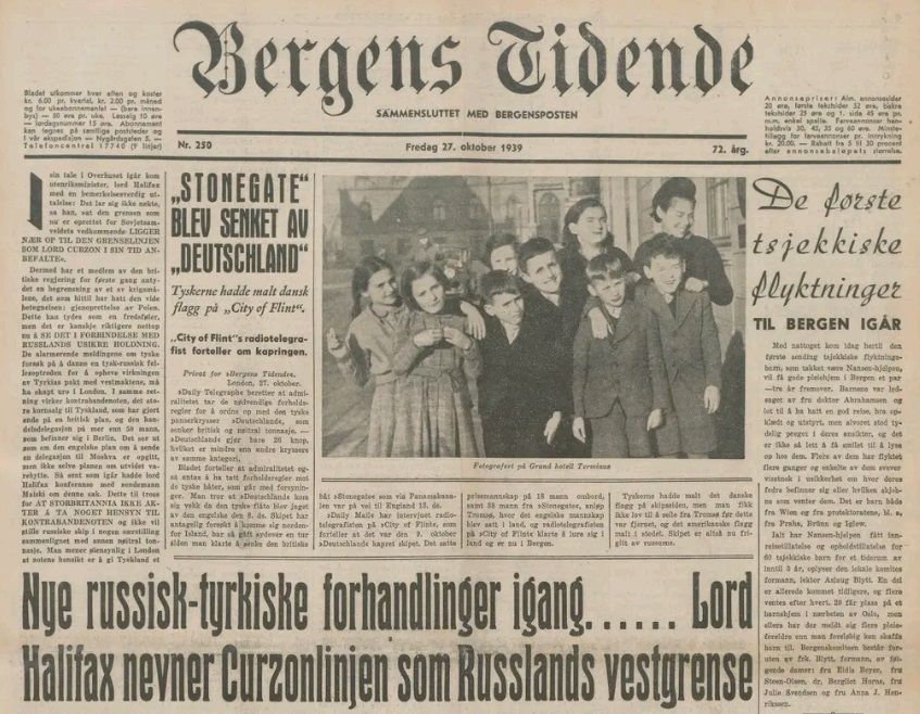 27. října 1939 vyšel v novinách Bergens Tidende na titulní straně článek o tom, že se předchozí den do Bergenu (pozn.: druhého největšího města Norska) dostali první čeští uprchlíci. Šlo o české děti židovského původu a na titulní straně těchto novin nechyběla ani jejich společná fotka.
