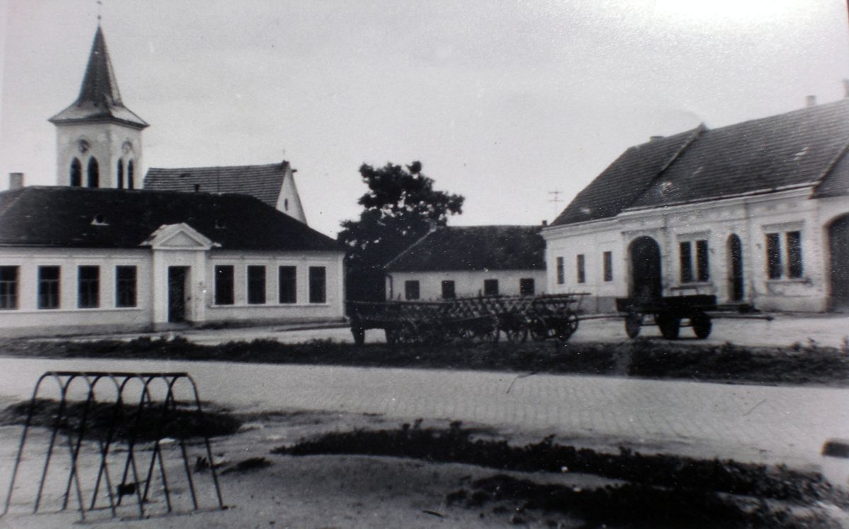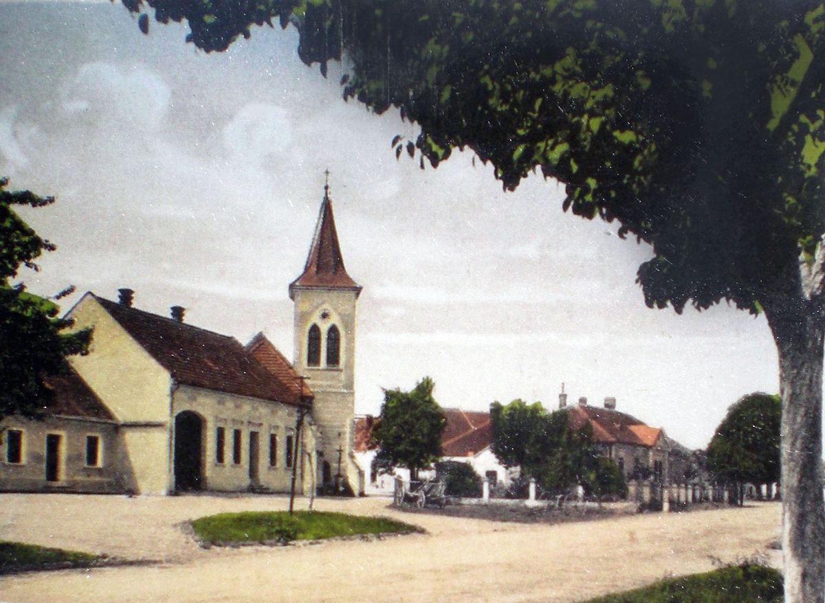 Předválečná fotografie Mušova. V popředí škola a za ní kostel.