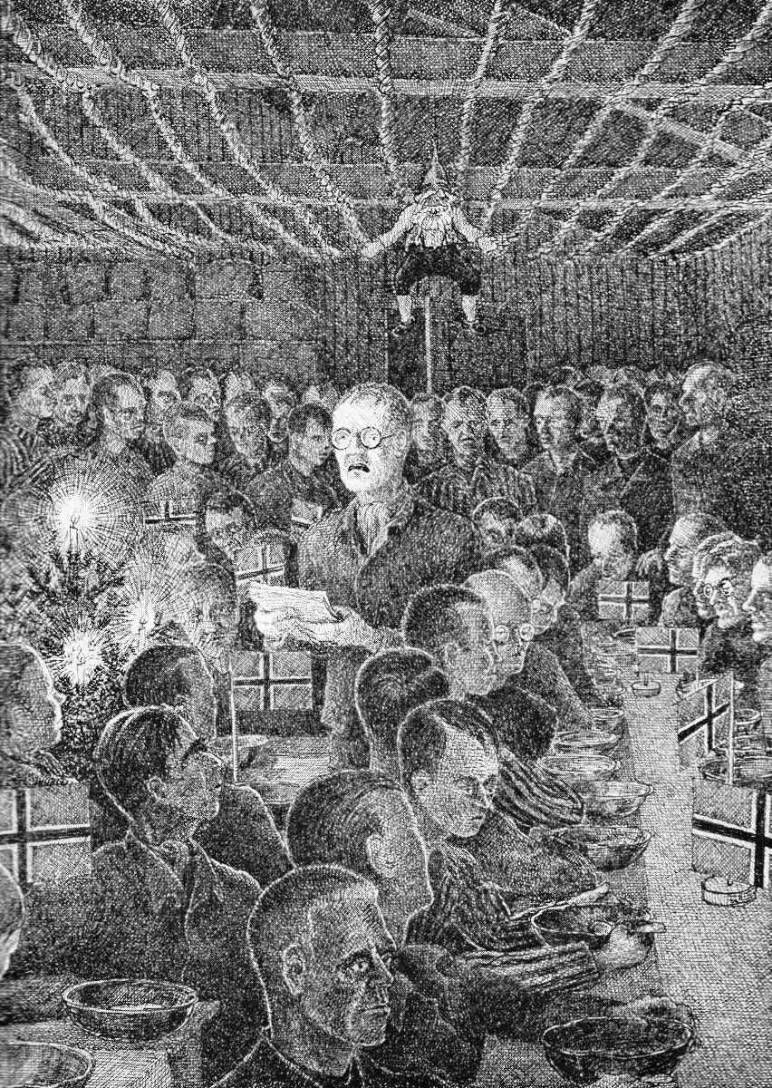 Vánoce v Sachsenhausenu: Legendární kresba Odda Nansena zachycující norského básníka Arnulfa Øverlanda, jak předčítá vlastní básně svým norským spoluvězňům.