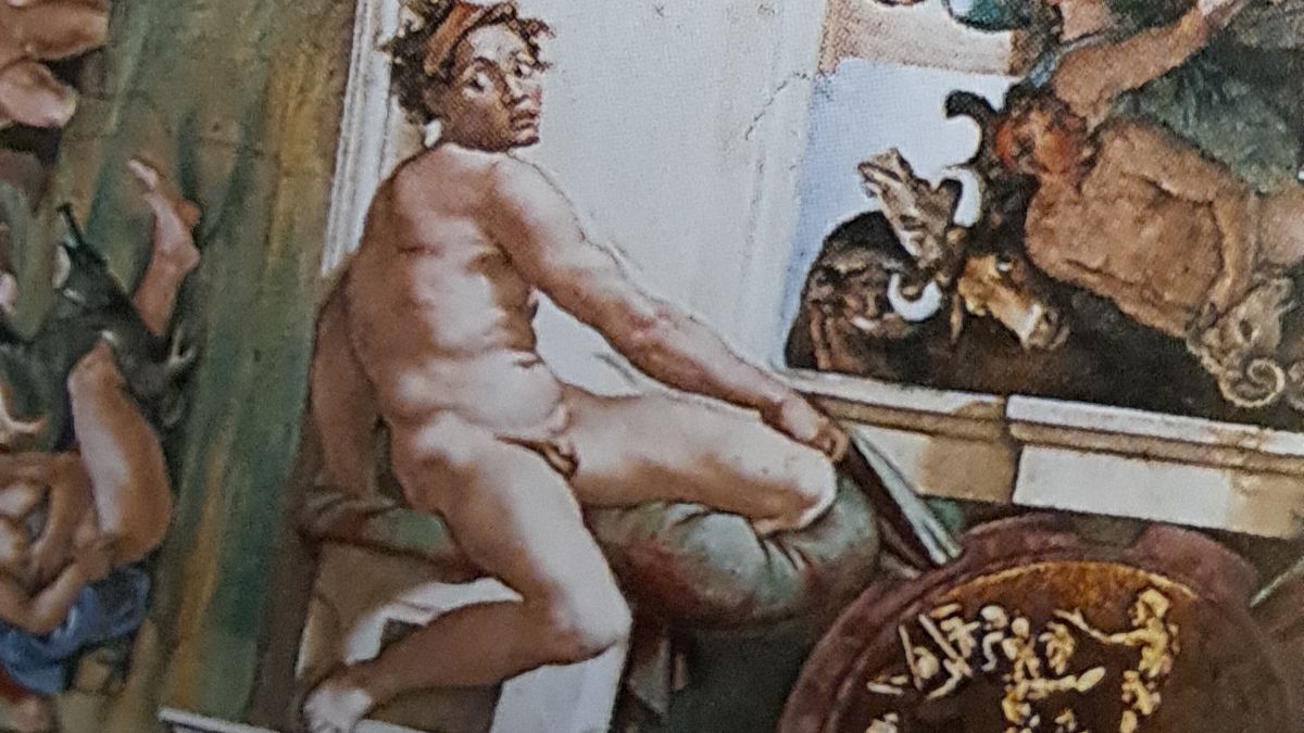 Typický gibbus (velké vyklenutí - hrb) na úrovni dolní hrudní části páteře a přechodu v její bederní část. Namaloval jste to velmi pěkně, drahý Michelangelo!