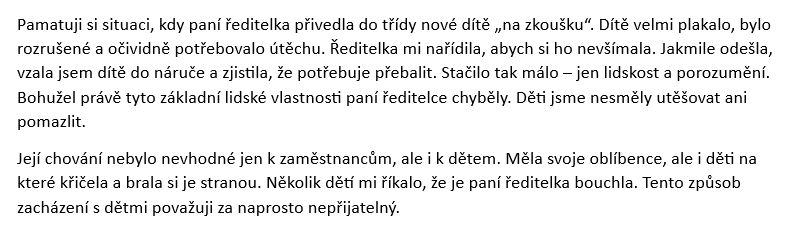 Hlas 2: Pamatuji si situaci, kdy paní ředitelka přivedla do třídy nové dítě „na zkoušku“. Dítě velmi plakalo, bylo rozrušené a očividně potřebovalo útěchu. Ředitelka mi nařídila, abych si ho nevšímala. Jakmile odešla, vzala jsem dítě do náruče a zjistila, že potřebuje přebalit. Stačilo tak málo – jen lidskost a porozumění. Bohužel právě tyto základní lidské vlastnosti paní ředitelce chyběly. Děti jsme nesměly utěšovat ani pomazlit. Její chování nebylo nevhodné jen k zaměstnancům, ale i k dětem. Měla svoje oblíbence, ale i děti na které křičela a brala si je stranou. Několik dětí mi říkalo, že je paní ředitelka bouchla. Tento způsob zacházení s dětmi považuji za naprosto nepřijatelný. Problémy byly i se stravováním. Jídlo se vozilo z menzy, často bylo studené a porce se dělily tak, že někdy nebylo dost pro všechny.