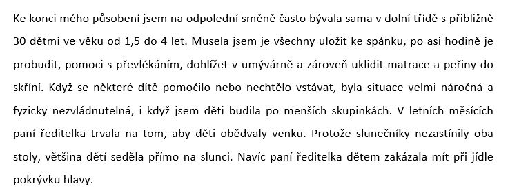 Hlas 1: Ke konci mého působení jsem na odpolední směně často bývala sama v dolní třídě s přibližně 30 dětmi ve věku od 1,5 do 4 let. Musela jsem je všechny uložit ke spánku, po asi hodině je probudit, pomoci s převlékáním, dohlížet v umývárně a zároveň uklidit matrace a peřiny do skříní. Když se některé dítě pomočilo nebo nechtělo vstávat, byla situace velmi náročná a fyzicky nezvládnutelná, i když jsem děti budila po menších skupinkách. V letních měsících paní ředitelka trvala na tom, aby děti obědvaly venku. Protože slunečníky nezastínily oba stoly, většina dětí seděla přímo na slunci. Navíc paní ředitelka dětem zakázala mít při jídle pokrývku hlavy. V dolní třídě byl chlapeček M., který měl dle maminky alergii na kravské mléko. Jednou při obědě přišla pomocná síla z kuchyně s informací, že tento chlapec nesmí danou omáčku, protože obsahuje mléko. Paní ředitelka ale rozhodla, že mu jídlo má vydat, že si „rodiče pořád něco vymýšlejí.“ V letních měsících bylo v horní třídě až kolem 50 dětí. I když jsme je rozdělily do menších skupin, péče o tak velký počet byla velmi náročná a pro mě osobně už nezvládnutelná. Jednou při obědě chlapec K., asi tříleté dítě, trochu vyrušoval, paní ředitelka ho velmi ostře napomenula a poté musel stát u učitelského stolu asi 10 minut. Chlapeček se paní ředitelce omlouval, sliboval, že už bude hodný a poplakával. Když paní ředitelka na chvíli odešla, dovolila jsem dítěti, aby si sedlo, ale po jejím návratu jsem byla pokárána za to, že jsem se do situace vměšovala. Navíc vůbec nereagovala na chlapcovu omluvu a řekla mu, že si to měl rozmyslet dřív a nemusel by stát. Během jednoho divadelního představení ve třídě jsem se napila. Paní ředitelka mi na to řekla, že „když bez pití musí vydržet děti, tak vy taky.“ Opakovaně také tvrdila, že se to dnes s pitným režimem zbytečně přehání. Mohu potvrdit, že si paní ředitelka občas vybíjela svoji zlost na dětech, zejména když zlobily nebo ji neposlouchaly. V některých případech je za trest tahala za uši. Ve školce kvůli jejímu chování často panovala stresující a nepříjemná atmosféra. Často křičela – jak na děti, tak na zaměstnance.