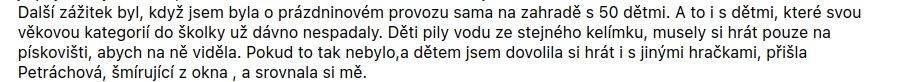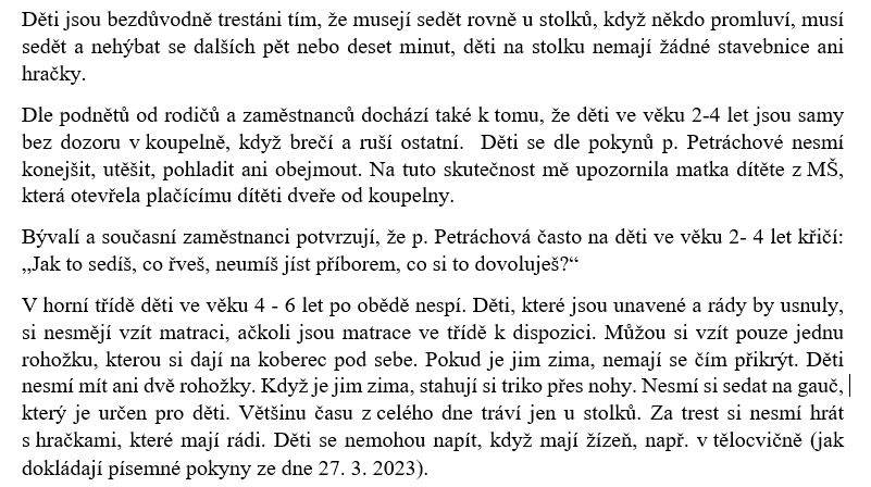 Hlas 4 (stížnost jednateli školky): Podivnou atmosféru strachu jsem v MŠ vnímala od začátku, děti nebyly téměř nikdy na koberci, pořád seděly u stolků bez podnětů, nepříčetně se na ně řvalo, nesmály se, nesměly sedět na sedačce, hrát si s oblíbenou hračkou, nesměly jít spát, když chtěly. Na spaní si směly vzít jen rohožku na spaní a druhou se přikrýt, ačkoli byly ve třídě matrace. Děti si o ně žádaly. Ve školce bylo ve dvou třídách přes 60 dětí, a to i dvouletých, často měla jedna osoba na starost 30 dětí, nesměly se pohladit, obejmout, utěšit, když plakaly. Zavíraly se do umývárny. Děti se nesměly napít, když potřebovaly, vše se dělalo ve spěchu a s řevem, když si někdo nestihnul nalít do kalíšku čaj, měl smůlu, na toalety se nesmělo na stolici, protože by se mohly malé záchody ucpat, děti klečely na hanbě, když kreslily a přetáhly, musely pořád vybarvovat stejný obrázek, ředitelka děti táhla do kanceláře za nohy ruce, vláčela děti za kapucu , mačkala jim paže, tahala je za vlasy, fackovala. Ve školce bylo spoustu dětí bez registrace, bez dokumentů, seznamy dětí se upravovaly podle potřeby. Jeden chlapec byl silou odvlečen k oknu, Petráchová s ním třásla a stlačovala mu horní paže, chlapec se bránil, chtěl se vysmeknout, při čemž na něj nepřiměřeným způsobem křičela: „Co si to dovoluješ? Takhle se chovej doma.“ Běžně křičela na děti ve věku 2 – 4 roky, že je už vážně zmlátí. Děti byly vyděšené a plačtivé. K nepřijatelnému a bezdůvodnému křiku na děti docházelo pravidelně, často několikrát za den. Výbuchy zlosti p. Petráchové směrem k dětem hraničí s nepříčetností. Došlo k zfackování pětiletého chlapce, který pořád dochází do MŠ. Docházelo také k tomu, že děti ve věku 2-4 let byly samy bez dozoru v koupelně, když brečí a ruší ostatní. Děti se dle pokynů Petráchové nesmí konejšit, utěšit, pohladit ani obejmout.Děti jsou bezdůvodně trestáni tím, že musejí sedět rovně u stolků, když někdo promluví, musí sedět a nehýbat se dalších pět nebo deset minut, děti na stolku nemají žádné stavebnice ani hračky. Dle podnětů od rodičů a zaměstnanců dochází také k tomu, že děti ve věku 2-4 let jsou samy bez dozoru v koupelně, když brečí a ruší ostatní. Děti se dle pokynů p. Petráchové nesmí konejšit, utěšit, pohladit ani obejmout. Na tuto skutečnost mě upozornila matka dítěte z MŠ, která otevřela plačícímu dítěti dveře od koupelny. Bývalí a současní zaměstnanci potvrzují, že p. Petráchová často na děti ve věku 2- 4 let křičí: „Jak to sedíš, co řveš, neumíš jíst příborem, co si to dovoluješ?“ V horní třídě děti ve věku 4 - 6 let po obědě nespí. Děti, které jsou unavené a rády by usnuly, si nesmějí vzít matraci, ačkoli jsou matrace ve třídě k dispozici. Můžou si vzít pouze jednu rohožku, kterou si dají na koberec pod sebe. Pokud je jim zima, nemají se čím přikrýt. Děti nesmí mít ani dvě rohožky. Když je jim zima, stahují si triko přes nohy. Nesmí si sedat na gauč, který je určen pro děti. Většinu času z celého dne tráví jen u stolků. Za trest si nesmí hrát s hračkami, které mají rádi. Děti se nemohou napít, když mají žízeň, např. v tělocvičně (jak dokládají písemné pokyny ze dne 27. 3. 2023).
