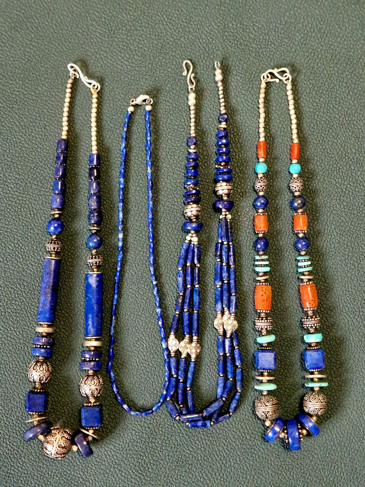 Vedle si všimnu pár obyčejně vypadajících korálů. Jenže oko vidí – a zapínání prozradilo punc 925. Takže přihazuju i je. A aby toho nebylo málo – nádherné korále z lapisu lazuli. Ten temně modrý kámen se zlatavými tečkami pyritu a bílými žilkami kalcitu vypadá skoro jako noční obloha. Každý kus po třiceti korunách. Nosit v igelitce truhlu pokladů – to je ten nejlepší pocit.