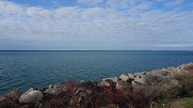 Výřez mapy ukazující trasy „Underground Railroad“ v oblasti jezer Ontario a Erie (červeně).