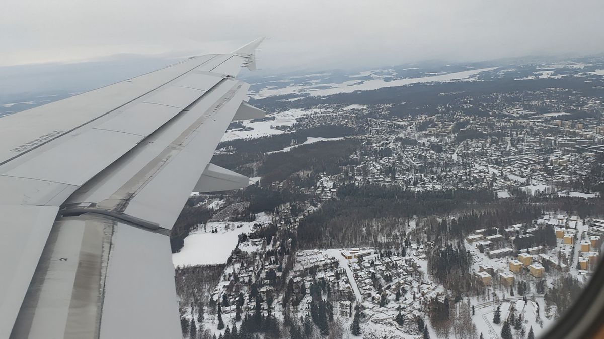 V průběhu celého letu z Prahy jsme měli slunečné počasí, místy i docela jasno. Čím víc jsme se ale blížili k našemu cíli, tím víc oblačnost pod námi houstla. Když pak naše letadlo začalo klesat, protnulo hustou stěnu těžkých mraků a pod nimi na nás čekala sivá obloha a zasněžené lesy a jezera protkané malebnými vesničkami.