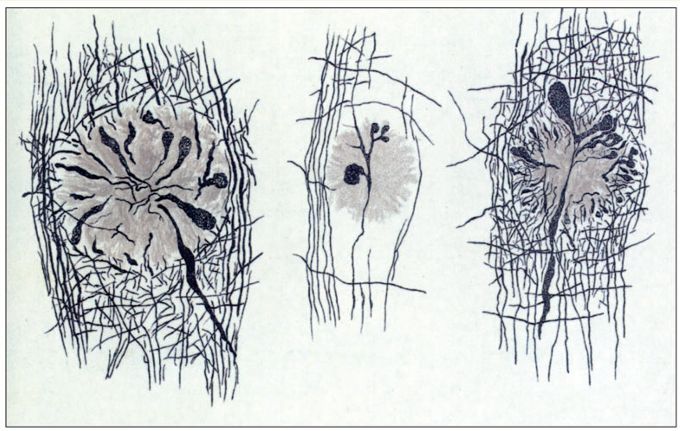 Kresby tří neuritických plaků z mozků pacientů se senilní demencí. Sestaveno z ilustrací Fischerova článku z roku 1907.