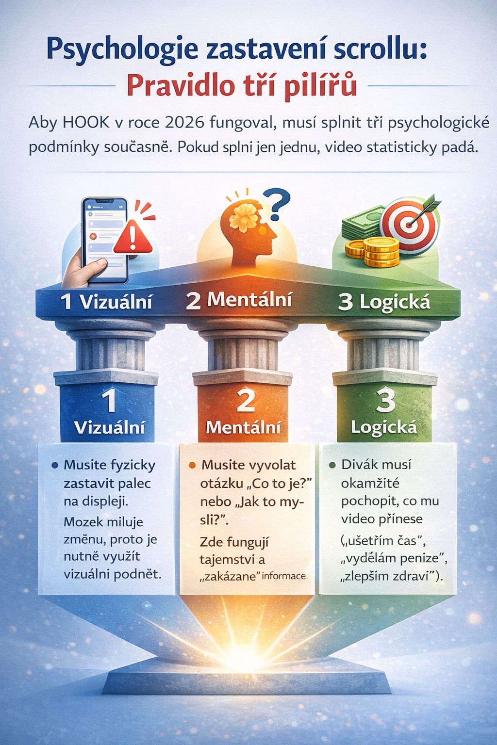Aby HOOK v roce 2026 fungoval, musí splnit tři psychologické podmínky současně. Pokud splní jen jednu, video statisticky padá.