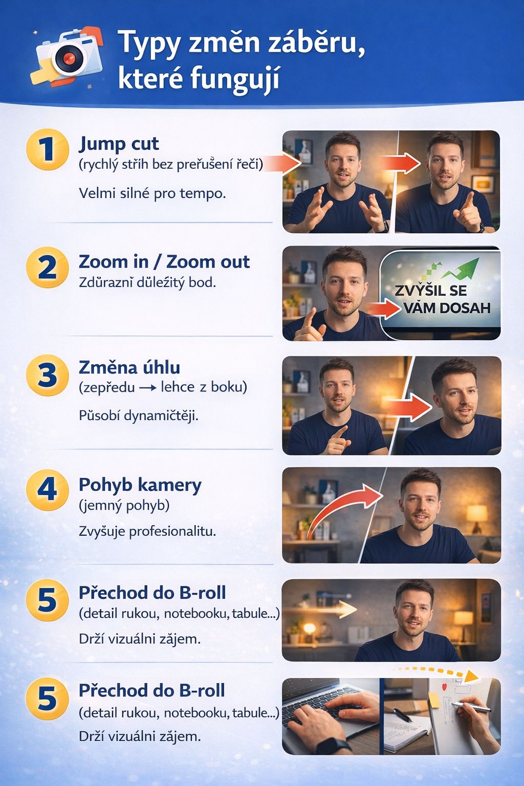 Tip z praxe: Pozor na „TikTok chaos“. Příliš mnoho střihů bez obsahu působí amatérsky. Cílem je dynamika, ale zároveň zachování „klidné autority“. Návod, jak by takový střih měl vypadat najdete v infografice, kterou jsem pro vás vytvořil.