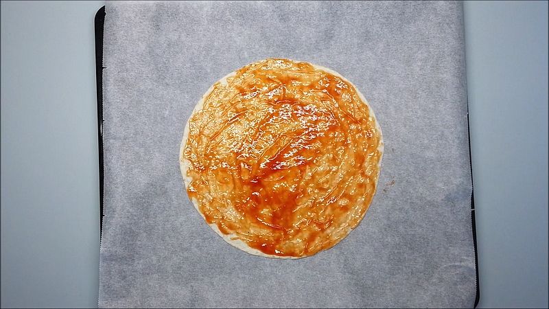 Tortillu dáme na pečící papír a potřeme kečupem.