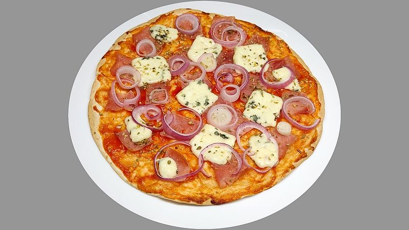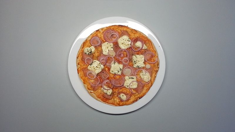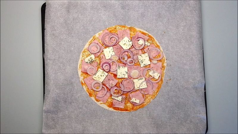 Přidáme šunku, nivu, červenou cibuli, sušené oregáno.
