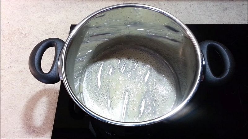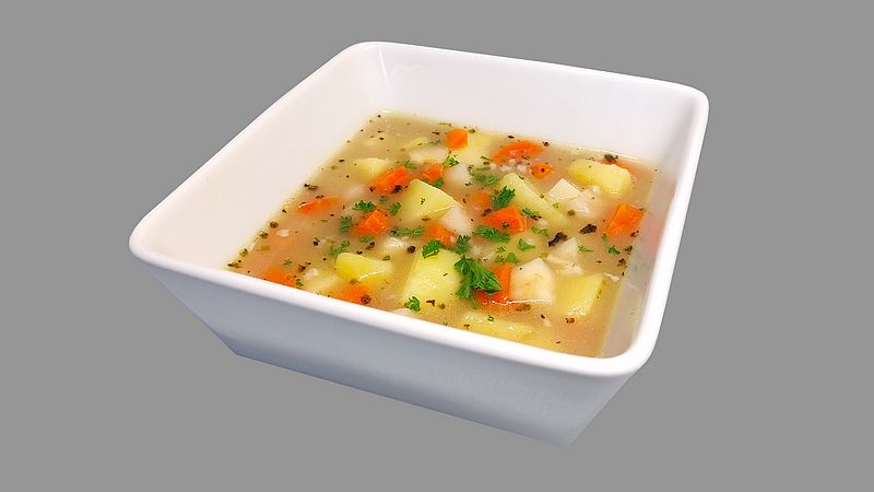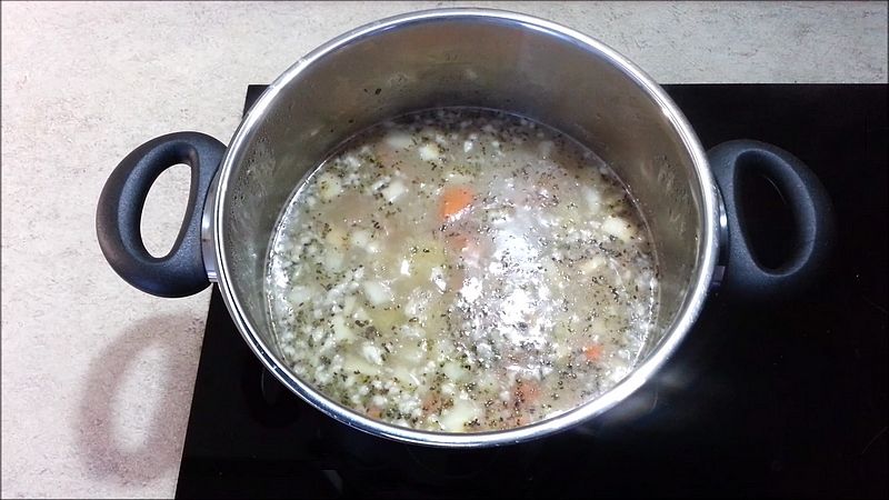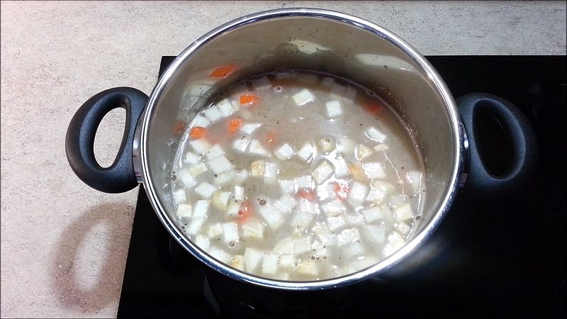 Pak přilijeme 1 litr vývaru (nebo vody a přidáme bujón), přidáme nakrájenou zeleninu 180 g mrkve, 70 g petržele, 50 g celeru a 500 g brambor. Dále přidáme mletý pepř, 1/2 lžičky drceného kmínu, polévku přivedeme k varu a vaříme 10 minut.